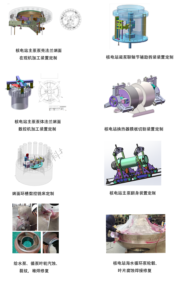 非标机电装置研发与制造,实现在特定环境与工况下某种特定的功能要求。研发制造各种现场机加工装备,对轴颈、平面、孔座、法兰等设备,在现进行车、铣、磨等机加工,同时可根据需要进行遥控、数控控制;轴颈、叶轮、阀芯、泵壳等类型设备,划伤、磨损、汽蚀、裂纹焊接修复。