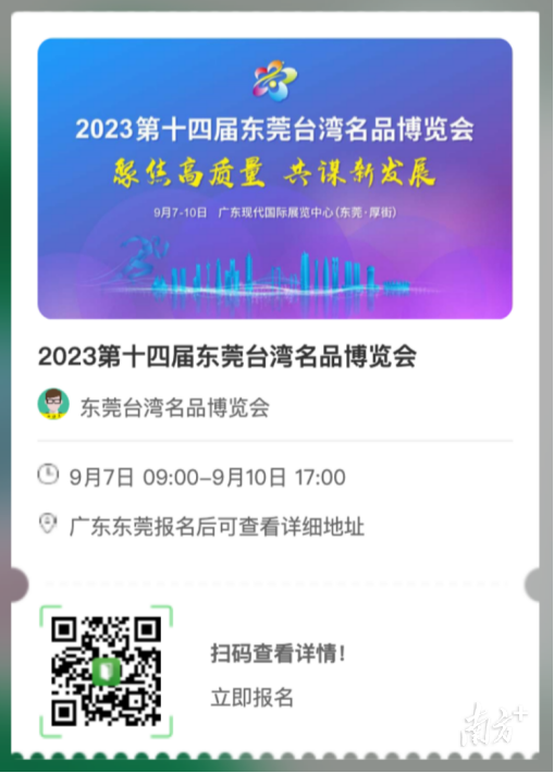 为深化两岸经贸合作与文化交流,由国务院台湾事务办公室经济局、广东省人民政府台湾事务办公室、广东省商务厅、东莞市人民政府、全国台湾同胞投资企业联谊会主办,东莞市台港澳事务局、东莞市商务局、东莞市工商业联合会、东莞市台商投资企业协会承办的2023年第十四届东莞台湾名品博览会,谨定于2023年9月7日-10日在广东现代国际展览中心举行。展会面积3.6万平方米,超过700家台资企业踊跃报名参展,展位超过2100个,为台商企业开拓大陆内销市场打通重要途径。