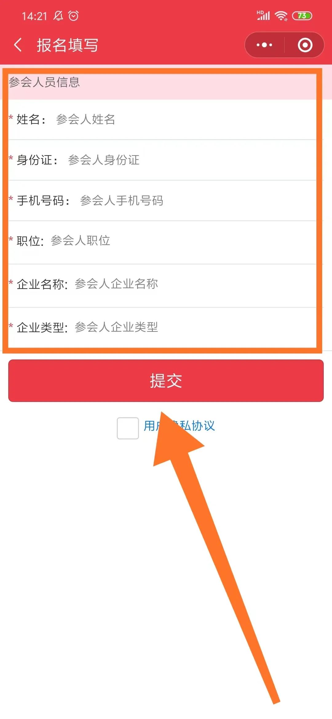 步骤三:填写”参会信息”,点击“提交”,并勾选“隐私协议”