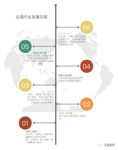 中国白酒产业的发展始于酒厂国营制改革下工业化生产的推进。大致可以分为以下六个阶段。
