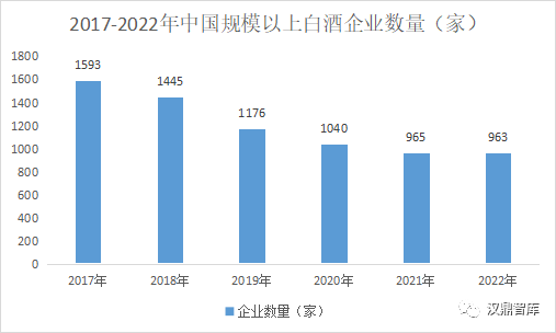 2017年,规模以上白酒企数量在达到顶峰后,白酒行业竞争格局加剧,行业集中度进一步提高。根据中国酒业协会统计,2017-2022年中国规模以上白酒企业由1593家下降至963家。虽然企业数量减少,但是白酒行业的营收依旧保持上升趋势,行业市场集中度进一步提升。