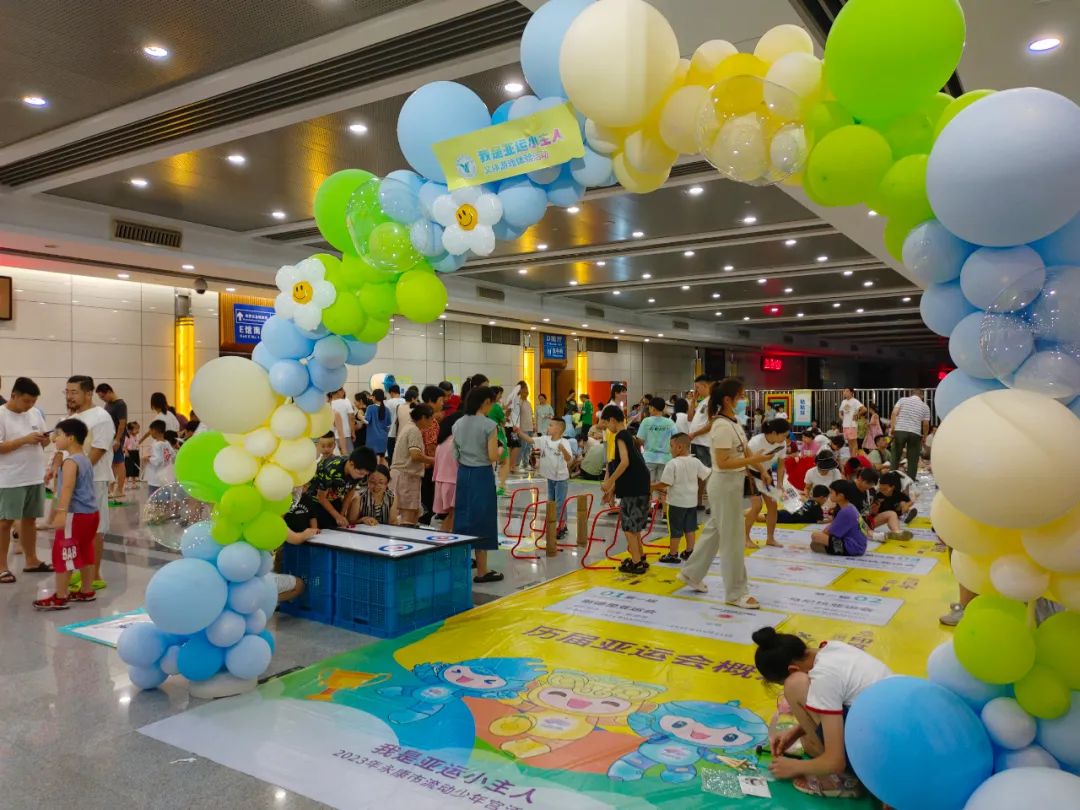 近日,为迎接第19届亚运会,市青少年宫在永康国际会展中心开展“我是亚运小主人”文体游戏体验活动。现场,童趣十足的气球、印满历届亚运会简介的迎宾毯以及各式亚运会知识展板渲染出浓厚的亚运氛围。该活动于8月5日至6日共开展两期,共计500余户家庭报名参与。