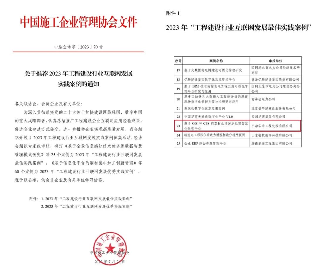 近日获悉,中冶华天开发的“基于GIS和CPS的农村生活污水处理智慧化运营平台”,成功入选2023年“工程建设行业互联网发展最佳实践案例”。这是继钢铁冶金板块的“中冶华天钢铁数字孪生及智慧运维平台”入选2022年“工程建设行业互联网发展最佳实践案例”后,中冶华天水环境板块智能化业务取得的又一次突破,体现了智能化业务与中冶华天“一体两翼”板块的深入对接与融合,再次有力彰显了中冶华天在工程建设行业互联网发展实践上的技术实力。
