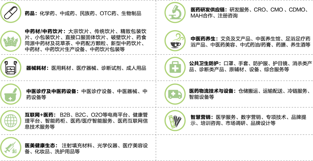 四十余年沉淀的品牌号召力和优质的行业口碑吸引着来自全国百余家医药工业百强、上市公司参展,其中不乏国药集团、通用技术中国医药、太极集团、华北制药、广药白云山、上海复星、天津医药、人福集团、北京同仁堂、罗欣药业、亚宝药业、天津红日、山西振东、悦康药业、神威药业、哈药集团、科伦药业、普洛药业、江苏恩华、大冢制药、艾兰得、百合股份、燕之屋、佰氏健康、亿超、善有加、长兴、柏维力、国药集团贵州大健康、威士雅、Nature Made、森下仁丹、Huebner、双心(Doppelherz)、Trace Minerals、Sunlife、Deealand、诺维信、澳乐维他等在内的行业领军企业以及2000+家国内医药大健康行业优秀企业。来自北京、福建、四川等十余个省市展团、众多优质海内外企业、各国际使领馆等于此展品牌、推新品,与行业同仁交流发掘商机,探讨寻找合作路径。展会设立二十五大展区,涵盖二十七大品类,专区专展,快速吸引目标受众前来谈生意!展示内容包含:展会吸引10万+代理商、经销商、连锁药店、电商、商超百货等渠道商和终端采购商参观洽谈,越来越多的同仁认可线下见面不可替代的价值。全国各地包括国药控股、上海医药、华润医药商业、九州通医药集团、国大药房、老百姓大药房、大参林、一心堂、益丰大药房、漱玉平民大药房、天猫国际、全球购、上药健康、易恒健康、苏宁易购、云集、天猫健康、京东健康、小红书、唯品会、亚马逊、药房网、浙江省医药保健品进出口有限公司、阿里健康、Tupperware、山姆、东方购物、南方购物、嗨购、北京同仁堂、药房网、屈臣氏、万宁、百联集团等专业观众将到场找产品、谈生意、面对面的交流。点击视频回顾2022中国医药健康领袖峰会精彩瞬间