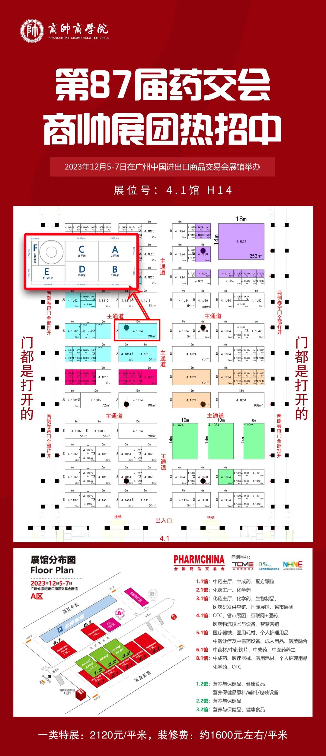 第87届全国药品交易会 & 中国国际健康营养博览会秋季展将于2023年12月5-7日在广州中国进出口商品交易会展馆举办!商帅商学院展团集中特装搭建位于4.1馆H14,主通道十字交叉口。