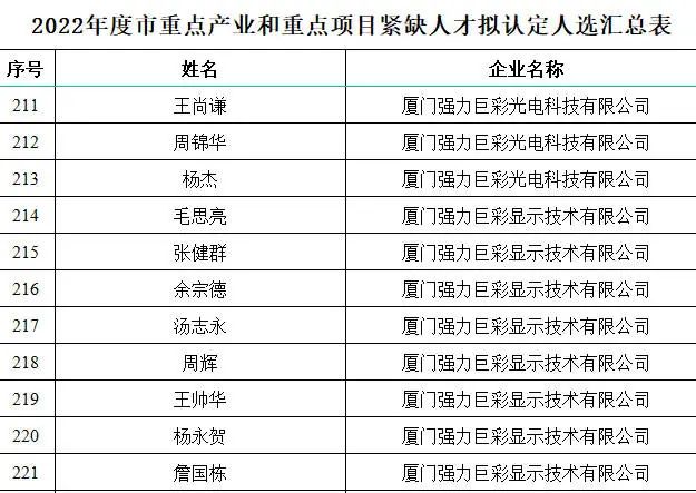 人才是第一资源,聚天下英才而用之,做好人才工作显得格外重要。此前,强力巨彩已有10人被认定为厦门市高层次人才,其中B类人才7人、C类人才3人。