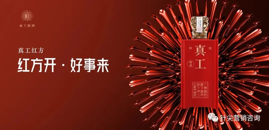 全国性大品牌是一个单品打天下,一个单品能通杀各大消费场景,商务招待,政务招待,宴席都是一个单品。因为品牌知名度强,产品价值高,人人都知道,但是大部分品牌是不具备这种基因。中小企业还是建议有一款专门针对宴席的产品,如果担心产品线过多,分的过细,不利于形成大单品,产品的设计与命名要兼顾宴席场景与其他场景都能使用,不突兀,不违和。对于品牌名先天存在宴席场景的缺陷,也可以通过产品的小名改变,比如我在服务一家地方酒厂时,为了抢占宴席,在天宝、地宝、物宝的基础上,又增加一款针对宴席的产品—喜宝,广告语:今年喜宝,来年得宝。比如:真工酱酒针对喜庆时刻的细分赛道产品“真工红方”,在传统中国红的基础上加入潮流元素,使真工红同时具有潮流与喜庆之美,红方开,好事来。