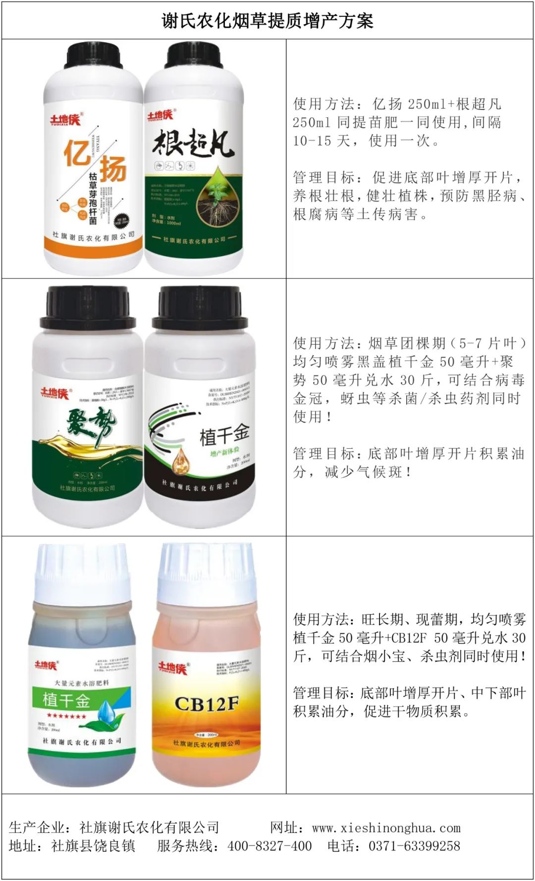 公司主要生产经营微生物菌剂、酵母有机肥、水溶肥等系列产品。公司一直与中国农科院、华南农业大学等众多科研机构及高等院校合作,科研力量雄厚,先后开发出了许多高效绿色产品。2010年,公司推出烟草提质增产套餐:植千金+CB12F,该产品定位精准、使用方便。自上市以来,已在云南、贵州、四川、湖南、广西、安徽、河南、福建等多地区、多品种烟草上使用,在增产增收、提高等级方面,立下了汗马功劳。2012年公司又推出了防治烟草根腐病、死苗死棵及青枯病、赤星病、野火病等系列产品。目前已形成从苗期、团棵期、生长期及成熟期全程管理方案。在烟草种植上我们做到了精准管理,真正给烟农带来了增产增收。以上系列产品以优异的使用效果征得了广大烟农的认可。在许多地区,农户指名购买这些产品。同时,也成为很多零售柜台上的拳头产品、放心产品。谢氏农化一心为农,只做老百姓认可的好产品;专业的技术服务团队,常年在全国各地巡回进行作物种植技术培训,将技术传递到千家万户,让作物丰产丰收!