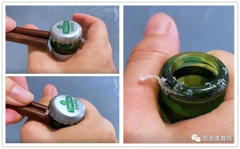 将一只手抓住啤酒瓶盖底部,然后将一端稍粗的筷子放在瓶盖与大拇指中间,用力一撬,瓶盖便会迅速松开。这是利用了杠杆原理,用筷子的力量撬动瓶盖,达到开启的目的。