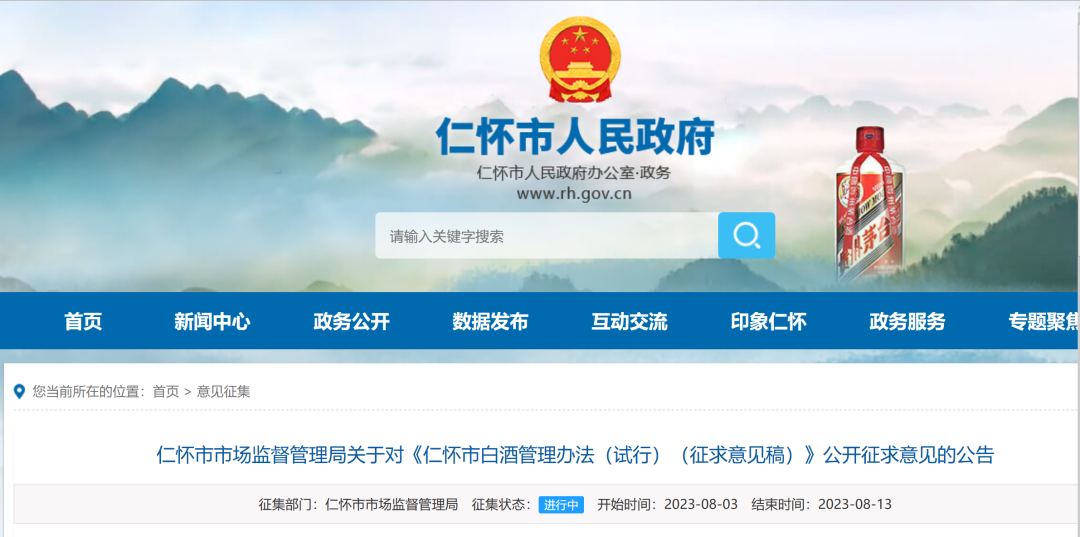 仁怀市市场监督管理局关于对《仁怀市白酒管理办法(试行)(征求意见稿)》公开征求意见的公告