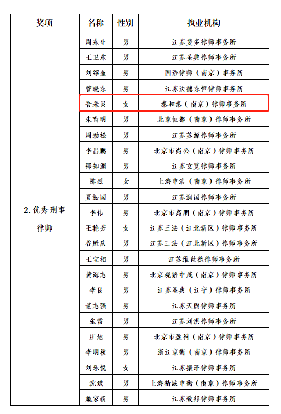 吾采灵律师先后荣获江苏省律师行业统筹推进疫情防控和经济社会发展工作先进个人、江苏省司法厅优秀立法专业团队、江北新区优秀女律师、泰和泰最佳法理研析等荣誉,多次在中国刑法学全国学术年会、江苏省法学会刑法学研究会学术年会、江苏省法学会犯罪学研究会学术年会上发言并荣获优秀论文。同时作为南京市及江宁开发区、江北新区、秦淮区人民检察院涉案企业合规第三方监督评估机制专业人员,提供企业合规法律服务。