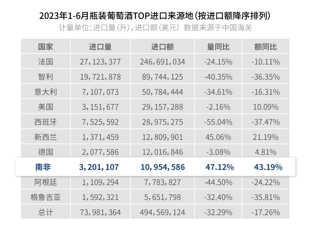 南非拥有360多年的葡萄酒酿造历史,是新世界产酒国家中可谓历史悠久。南非独特的地理环境、历史和人文基础,使得它的葡萄酒融合了新世界与旧世界特征。南非凭借多样的气候和地理特质,不仅孕育了优质的白诗南,还酿造出一流的长相思(Sauvignon Blanc)、霞多丽(Chardonnay)、黑皮诺(Pinot Noir)等凉爽产区的葡萄酒,同时也能出产浓郁、饱满、醇厚的赤霞珠(Cabernet Sauvignon)、品诺塔奇(Pinotage)、西拉(Syrah)、国产多瑞加(Touriga Nacional)、歌海娜(Grenache)等适合炎热气候的葡萄酒。如同彩虹之国的美名,南非的葡萄酒展现出多姿多彩、非同凡响的品质。2023年1-6月,南非葡萄酒对中国的出口出现逆势增长,成为前10对华葡萄酒出口国增长率最高的国家。根据中国海关数据分析,南非进口葡萄酒的进口量增长接近50%, 进口金额增长量超过40%。南非出口数据显示,今年1-6月瓶装白葡萄酒对华出口增幅超过50%。