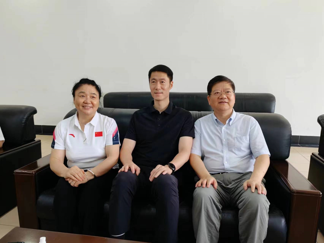 中国乒协副主席、上海市乒乓球协会会长、上海市竞技体育训练管理中心主任王励勤(中)上海地市商会会长联合会副会长兼秘书长周波(右)上海地市商会会长联合会副会长、上海市河南三门峡商会会长刘艳丽(左)合影