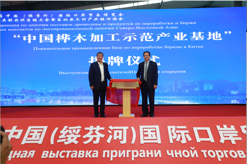 绥芬河市委副书记、市长王镭介绍了绥芬河的开放优势、地缘优势、产业优势。绥芬河是承接国内各地木业产业转移升级的最佳平台,绥芬河支持企业在采伐回运、精深加工等方面参与木业产业合作,引领木业产业精深化、品牌化发展。刘能文与王镭共同为“中国桦木加工示范产业基地”揭牌。据了解绥芬河市拥有丰富的桦木进口资源,已成为中国重要的桦木贸易、加工基地。