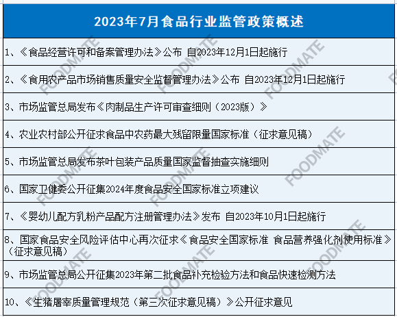 2023年7月,国家市场监管总局、国家卫健委、国家食品安风险评估中心等部门发布了一系列食品行业监管政策,食品伙伴网整理汇总如下: