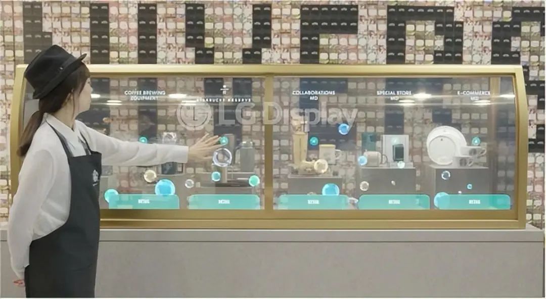 透明OLED在零售场景的应用同样非常惊艳,商店的门头、橱窗、展柜、隔断、吊装等所有玻璃相关的地方,都可以用透明OLED屏幕替换,维持空间开放感、通过使用吸引消费者眼球的创意内容提升品牌形象。比如星巴克店内的吊装透明OLED屏幕,让消费者浏览商品信息的同时,完全没有普通屏幕带来的压抑感。