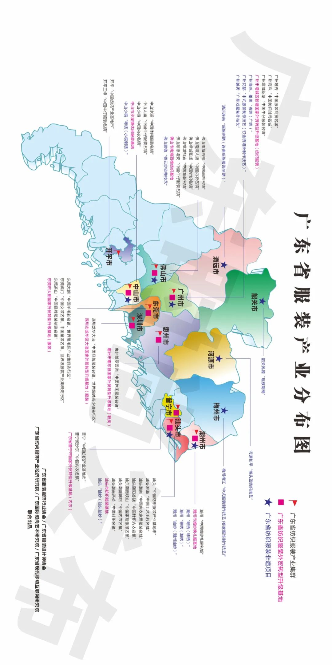 广东省东莞市大朗镇 中国羊毛衫名镇、世界级毛织产业集群先行区广东省东莞市虎门镇 中国女装名镇、中国童装名镇、世界级服装产业集群先行区广东省深圳市龙华区大浪时尚小镇 中国品牌服装名镇、世界级时尚小镇先行区广州市花都区:中式服装制作技艺(钉金绣裙褂制作技艺)梅州市梅江区:中式服装制作技艺 (客家服饰制作技艺)清远市连南瑶族自治县:瑶族刺绣(连南瑶族服饰刺绣)
