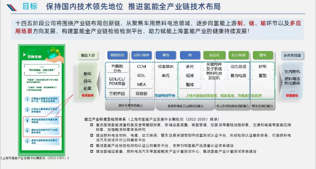 我中心主任张焰峰博士介绍了以上海汽检领衔的上海检测机构,围绕产业链布局创新链,从聚焦车用燃料电池领域,逐步向氢能上游制、储、输环节以及多应用场景方向发展,构建氢能全产业链检验检测平台,助力赋能上海氢能产业的健康发展的布局。