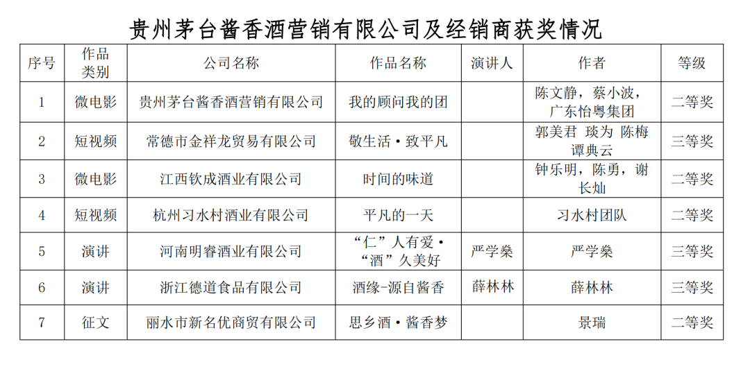 经过评委评选,酱香酒公司选送的微电影《我的顾问我的团》、江西钦成酒业有限公司选送的微电影《时间的味道》;杭州习水村酒业有限公司选送的微视频《平凡的一天》、常德市金祥龙贸易有限公司选送的微视频《敬生活 致平凡》;浙江德道食品有限公司演讲作品《酒缘—源自酱香》、河南明睿酒业有限公司演讲作品《“仁”人有爱 “酒”久美好》;丽水市新名优商贸有限公司征文作品《思乡酒·酱香梦》分别获得微电影单元二等奖、微视频单元二等奖、三等奖、演讲比赛三等奖及征文单元二等奖。
