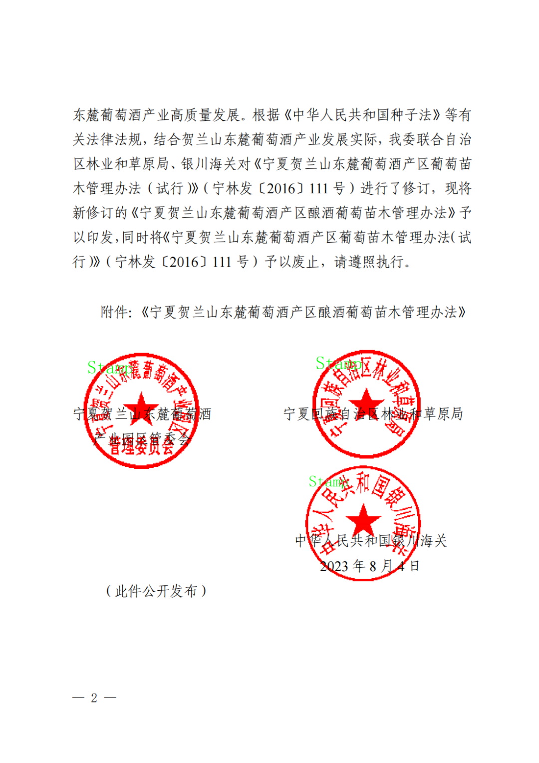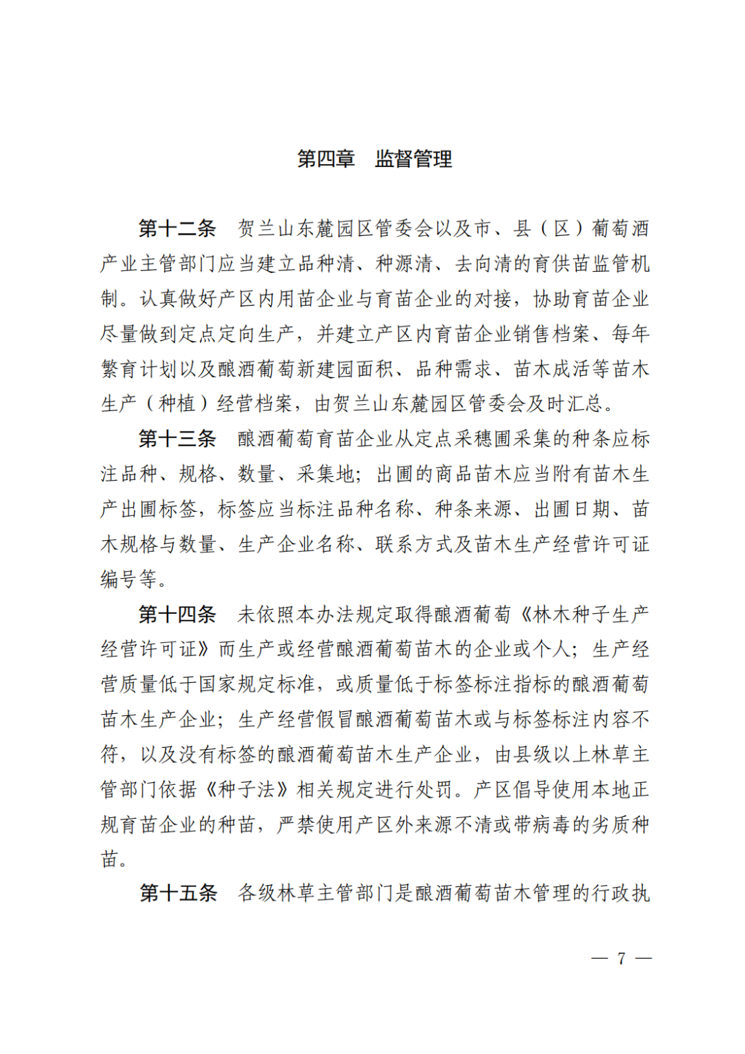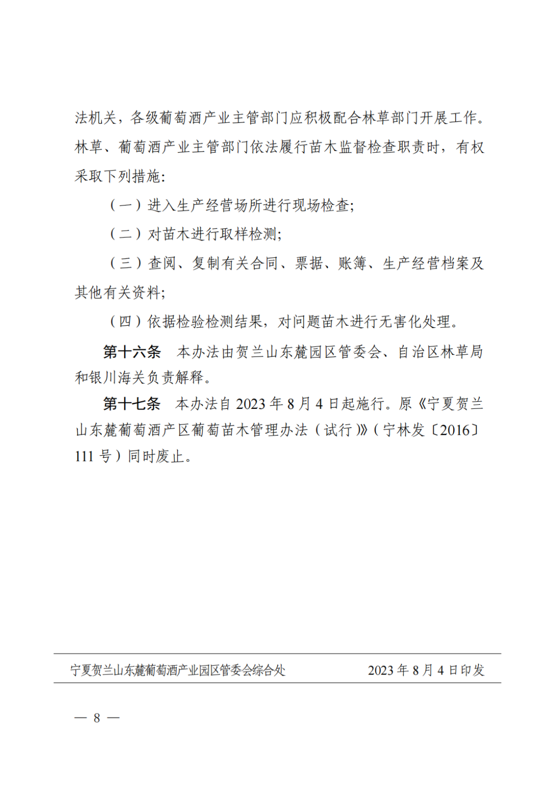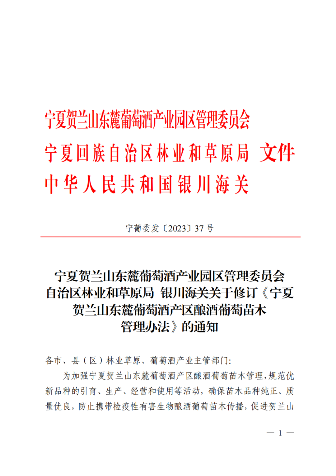 附件:宁夏贺兰山东麓葡萄酒产业园区管理委员会 自治区林业和草原局 银川海关关于修订《宁夏贺兰山东麓葡萄酒产区酿酒葡萄苗木管理办法》的通知