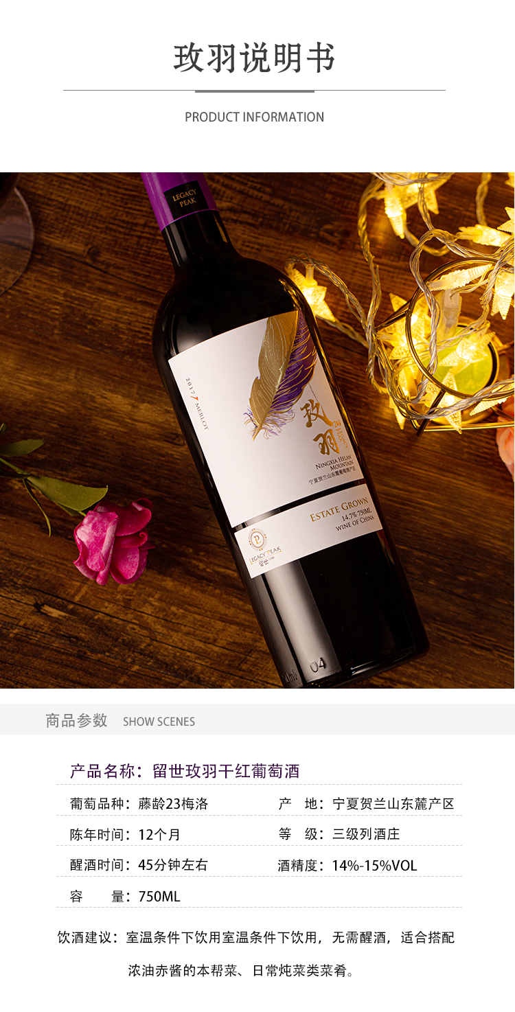 -留世传奇是酒庄唯一一款混酿:赤霞珠和美乐分别带来了草莓,红梅,青椒的香气。19个月橡木桶陈酿增加了香气和口感的复杂度,赤霞珠为酒体带来丰富的单宁和漂亮的酸度,美乐则使酒体变得丰腴。近期饮用需要醒酒超过1小时,适合搭配炙烤羊肋排等菜肴,也可单独饮用。