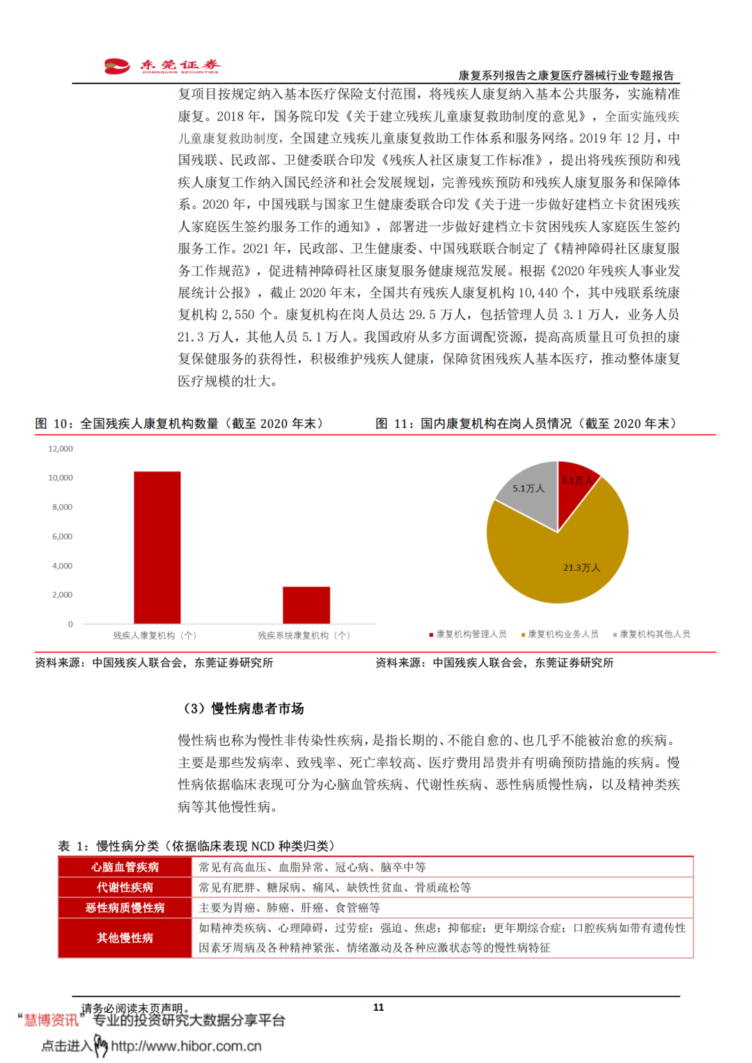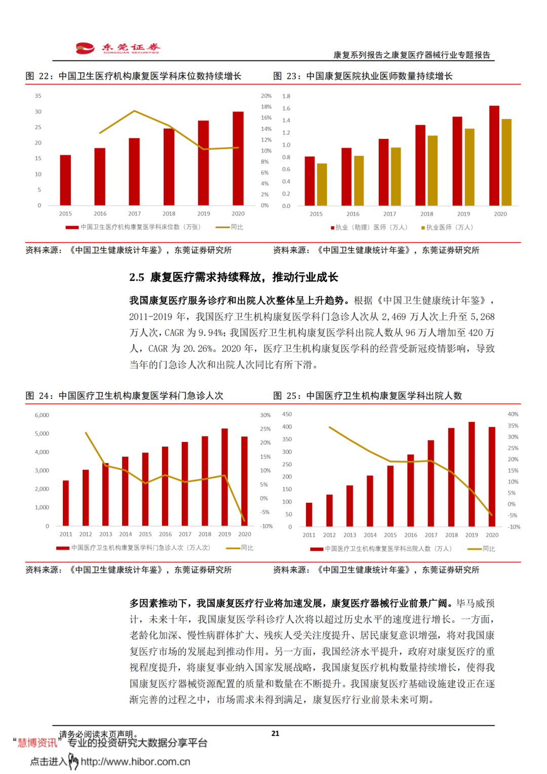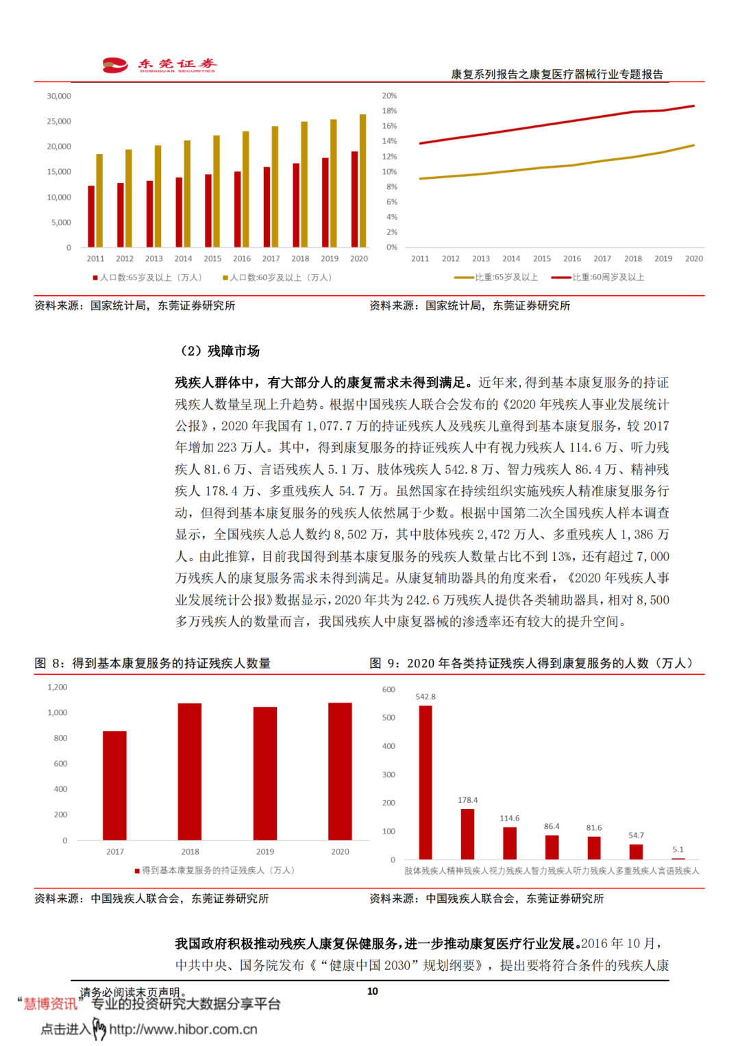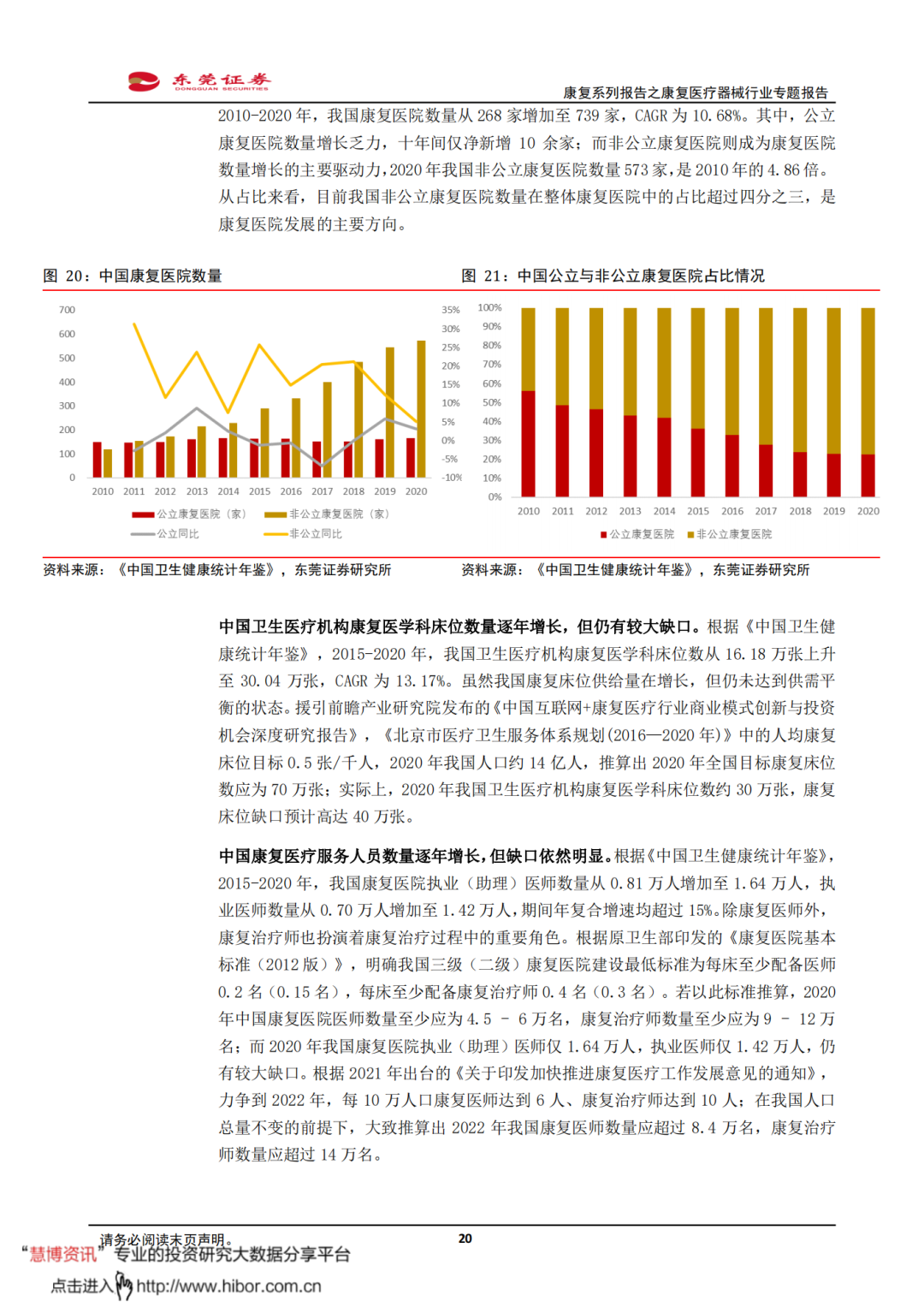 ◼ 我国康复医院数量持续增加,康复医学科床位数逐年增长。根据《中国卫生健康统计年鉴》,2010-2020年,我国康复医院数量从268家增加至739家,CAGR为10.68%。其中,非公立康复医院是康复医院数量增长的主要驱动力;2020年我国非公立康复医院数量573家,是2010年的4.86倍。2015-2020年,我国卫生医疗机构康复医学科床位数从16.18万张上升至30.04万张,CAGR为13.17%。虽然我国康复床位供给量在增长,但仍未达到供需平衡的状态,供给端存在较大缺口。