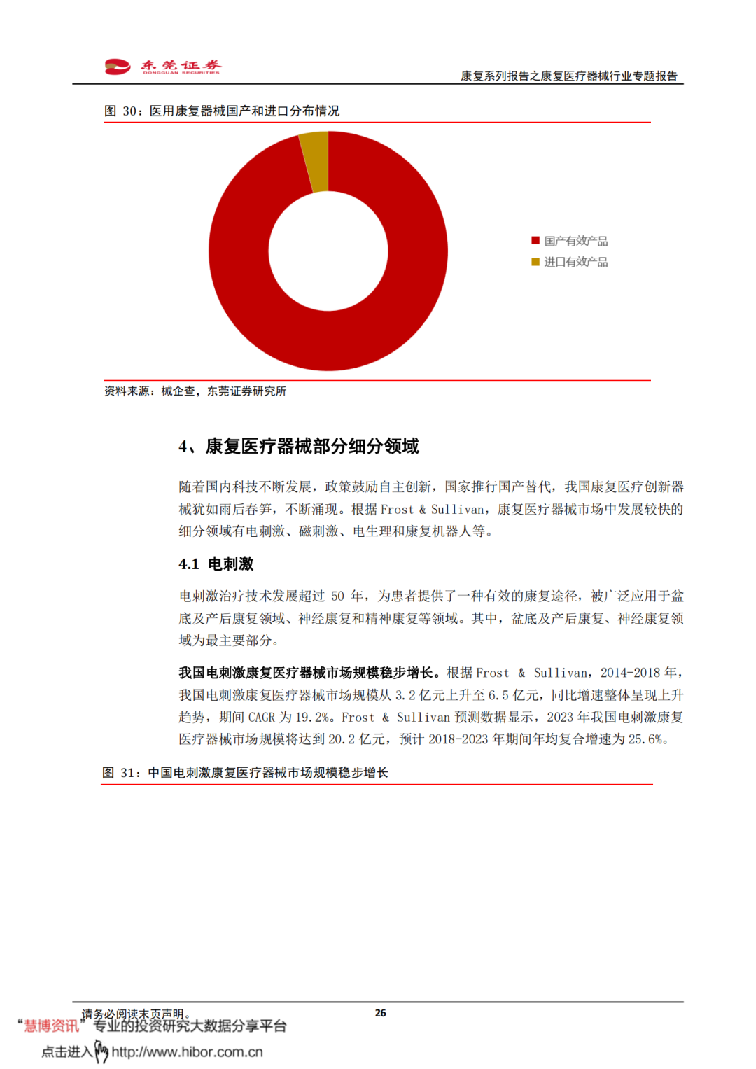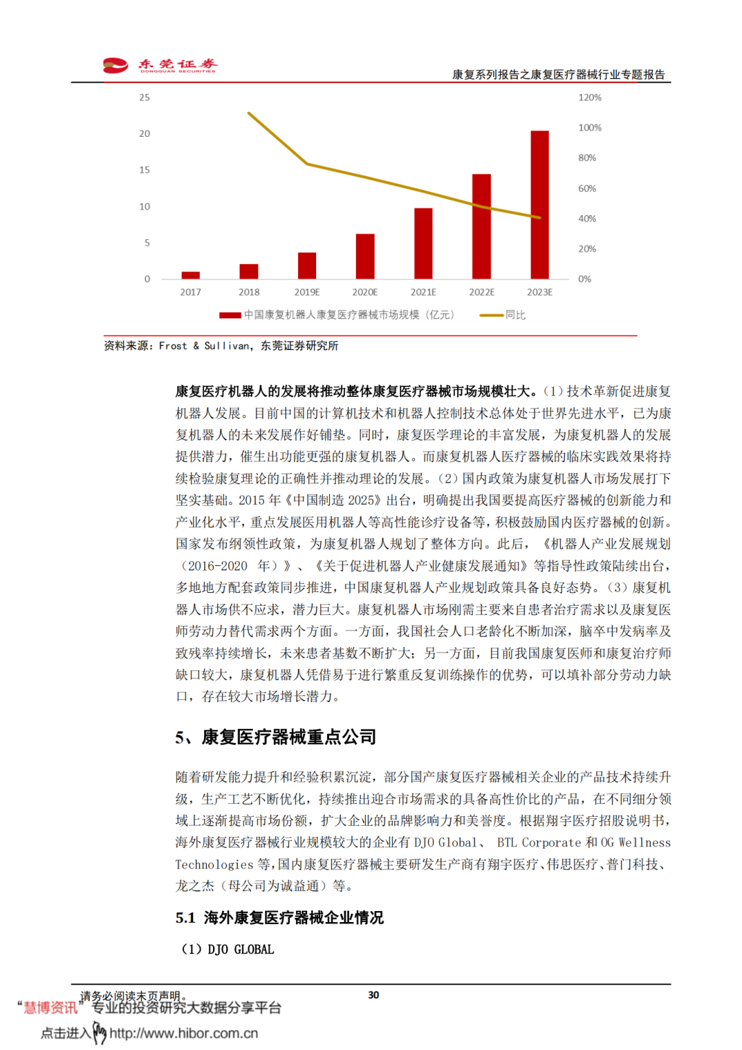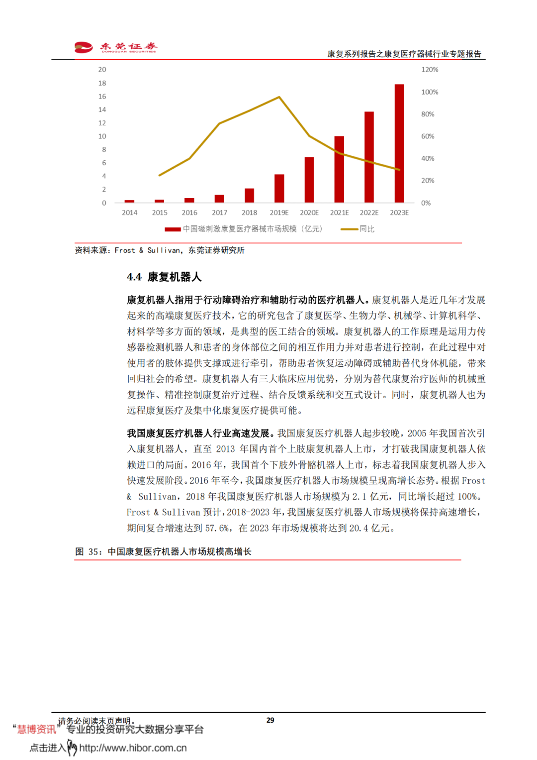 ◼ 我国康复医疗需求释放,有望带动康复医疗器械市场保持较快增长。根据Frost & Sullivan,2014-2018年,我国康复医疗器械市场规模从115亿元增长至280亿元,CAGR达到24.9%。Frost & Sullivan预测数据显示,我国康复医疗器械市场规模将在2023年增加至670亿元,2018-2023年期间的年复合增速将为19.1%。我国康复医疗需求释放,有望带动康复医疗器械配置需求持续提升,推动整体市场规模较快增长。