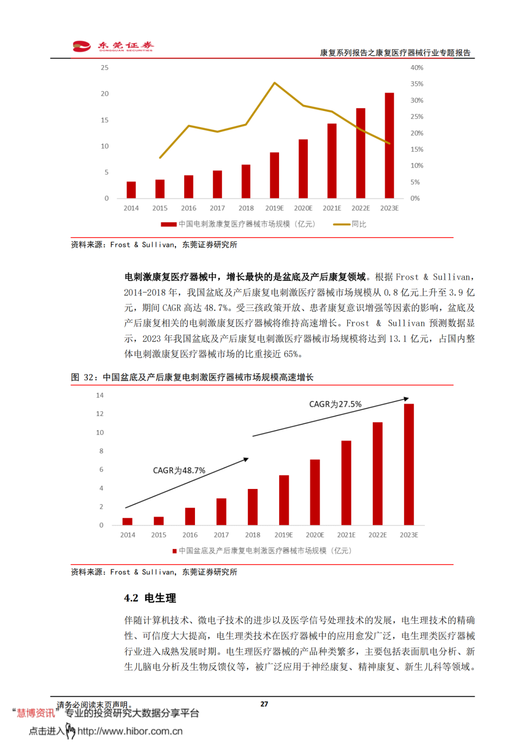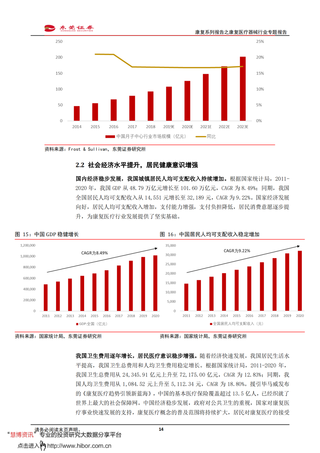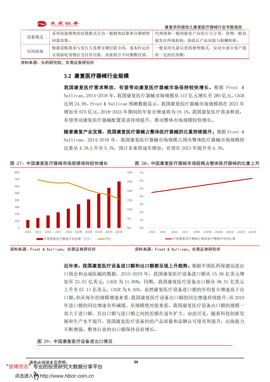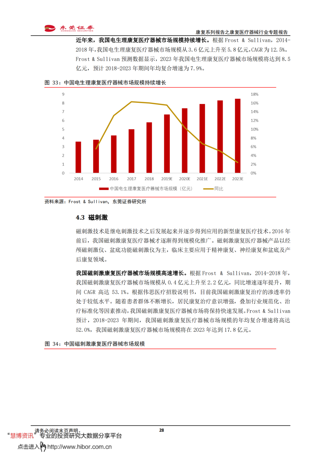 ◼ 我国康复医疗需求释放,有望带动康复医疗器械市场保持较快增长。根据Frost & Sullivan,2014-2018年,我国康复医疗器械市场规模从115亿元增长至280亿元,CAGR达到24.9%。Frost & Sullivan预测数据显示,我国康复医疗器械市场规模将在2023年增加至670亿元,2018-2023年期间的年复合增速将为19.1%。我国康复医疗需求释放,有望带动康复医疗器械配置需求持续提升,推动整体市场规模较快增长。