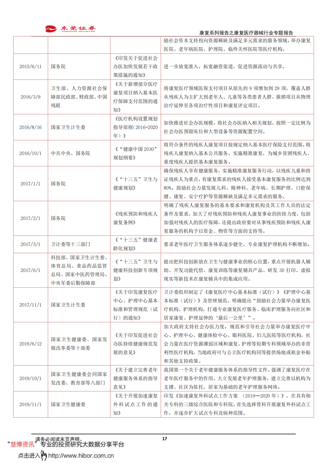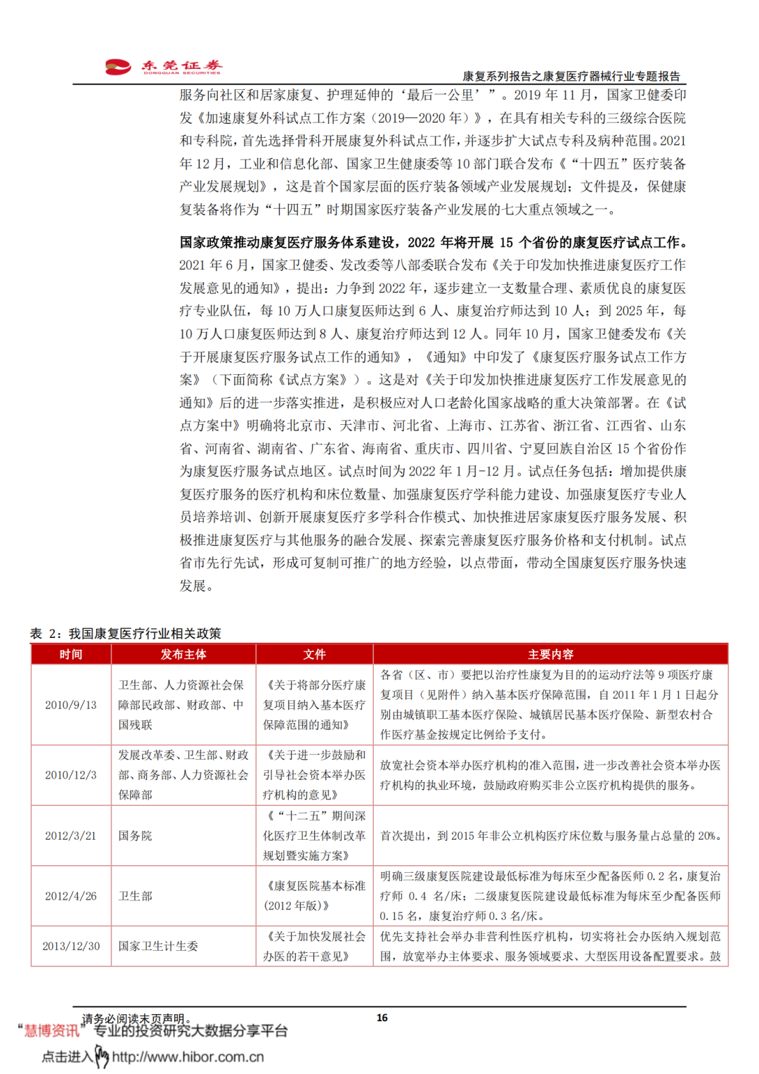 ◼ 近期康复医疗相关政策频出,助力康复产业加速发展。2021年6月,国家卫健委、发改委等八部委联合发布《关于印发加快推进康复医疗工作发展意见的通知》,提出要逐步建立一支数量合理、素质优良的康复医疗专业队伍,力争到2022年,每10万人口康复医师达到6人、康复治疗师达到10人。同年10月,国家卫健委发布《关于开展康复医疗服务试点工作的通知》,2022年将开展15个省份的康复医疗试点工作,积极应对人口老龄化。试点省市先行先试,形成可复制可推广的地方经验,以点带面,带动全国康复医疗服务快速发展。