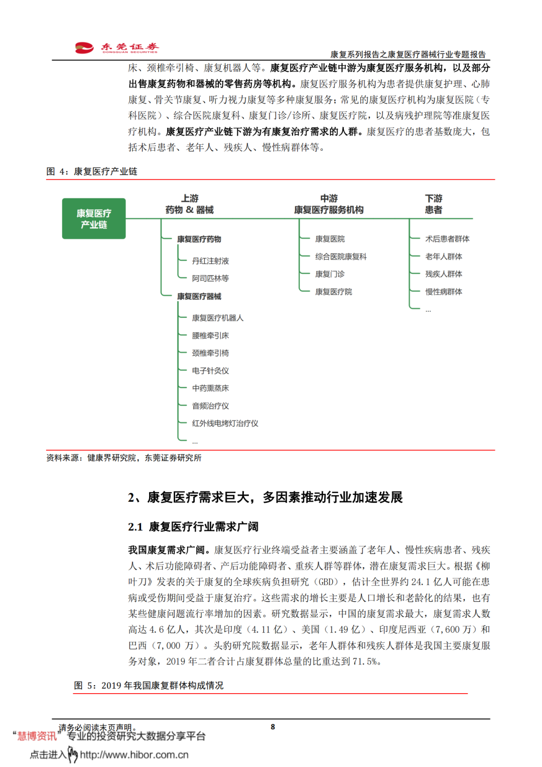 ◼ 我国康复需求广阔。康复医疗行业终端受益者主要涵盖了老年人、慢性疾病患者、残疾人、术后功能障碍者、产后功能障碍者、重疾人群等群体,潜在康复需求巨大。根据《柳叶刀》发表的关于康复的全球疾病负担研究(GBD),估计全世界约24.1亿人可能在患病或受伤期间受益于康复治疗。其中,中国的康复需求最大,康复需求人数高达4.6亿人。