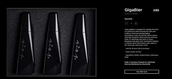 此前,特斯拉在欧洲市场推出一款皮尔斯纳风格啤酒 GigaBier,3瓶售价89欧元,也就是668元人民币,一瓶200多块,官方透露,这款酒330ml,酒精含量5%,还是限量版,每个人最多可订购3瓶。