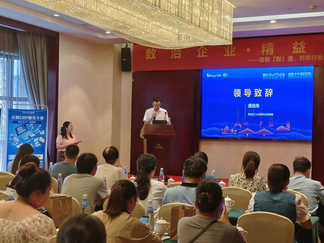 8月9日下午,"服装'智'造,引领行业数字化管理新模式"主题活动在惠安县达利世纪酒店举办,活动由县工信商务局和财政局主办,县校园服饰装备行业协会、中国电信股份有限公司惠安分公司协办,福建省宾果云数字科技有限公司承办。县工信商务局副局长黄桂烽、财政局副局长黄琼玲,各镇、园区相关业务负责人以及龙豪、爱格乐、新同兴等70多家企业代表参加。