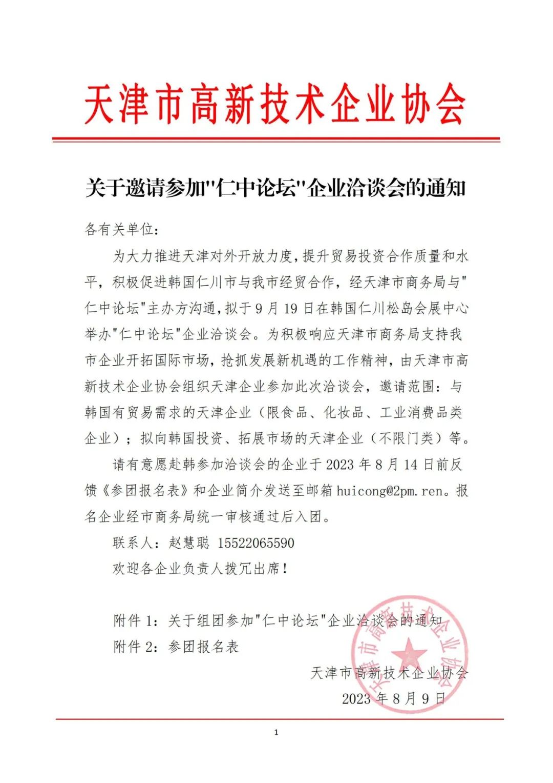 关于邀请参加”仁中论坛”企业洽谈会的通知