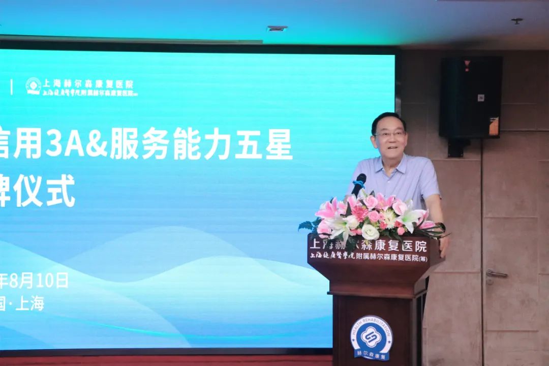 上海赫尔森康复医院院长沈祥开代表医院发表致辞,他表示,医院通过双评现场评价,荣获“信用3A级医院和服务能力五星级医院”称号,成为社会办医标杆单位,这既是对我院医疗技术、服务品质等方面的认可,也是对医院未来发展的积极鼓励,更是医院连续5年,每年开展一项主题活动,不断提升医疗质量和服务水平,不断强化医院管理和内涵建设,长期坚持走“特色型、品牌化”和规范可持续发展道路的成果体现。自今年年初医院申请参加中国非公立医疗机构社会信用等级与服务能力星级评价开始,每一位“赫尔森人”都以“双评”为契机,对我院推进创建管理工作高质量发展、推动医院医教研可持续发展具有积极作用。他强调,医院将以此为契机,以“不待扬鞭自奋蹄”的精神,继续围绕“双评”标准,持续建设,在上海市社会医疗机构协会的指导下,进一步强化管理,优化队伍建设,提升细化内涵,进一步求实创新,培育特色专科,促进医教研管同步发展,进一步砥砺奋进,努力推进附属医院建设,不断规范完善提升医院管理水平,推动医院高质量发展,实现医院高效能治理。