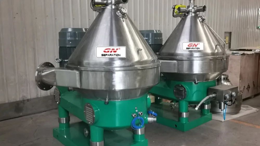 近日,河北冠能分离输送设备有限公司一台三相碟片分离机在场完成安装调试工作,准备发往海外植物油加工厂,用于植物油生产的提纯工作,碟片分离机其工作原理依靠不同物质的密度不同所有离心机也不同,产生分层的现象,从而达到分离的目的。其工作原理与离心机接近,但是叠片机可以产生更高的转速和更大的分离因数,更加适合分离一些细小,度差小且不相溶的物料。