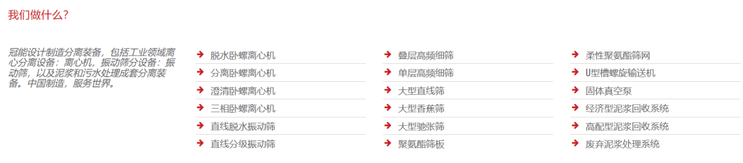 GN冠能分送专业生产分离装备,包括:卧螺离心机,碟片离心机,矿山振动筛,固体真空泵,叠螺脱水机等。冠能公司于2007年进入分离装备领域,拥有3大制造工厂,总面积约11万平米(170亩)。冠能分送生产基地毗邻北京,产品远销70多个国家和地区,国际业务占比70%以上。为了便于更好的服务当地客户,冠能已在美国休斯顿和俄罗斯莫斯科设立分支机构。冠能工厂拥有多套自动焊接机器人工作站,大型激光切割机,进口数控加工中心,数控车床,大型数控注塑机,自动抛丸机等先进加工设备。冠能公司管理体系完善,冠能分送通过了ISO9001, ISO14001, ISO45001,美国API Q1质量管理体系认证。冠能分送产品获得了欧盟CE,俄罗斯EAC质量认证。冠能分送公司管理系统采用ERP云+CRM云管理系统。
