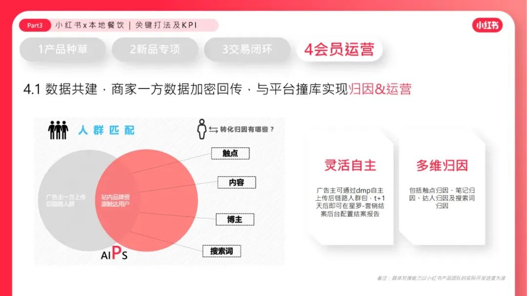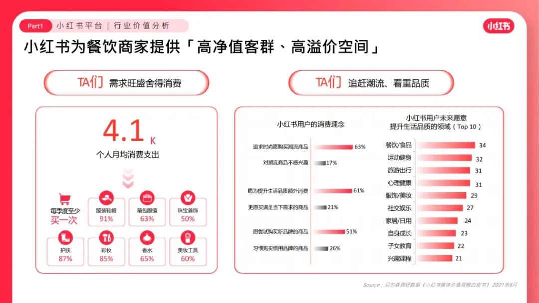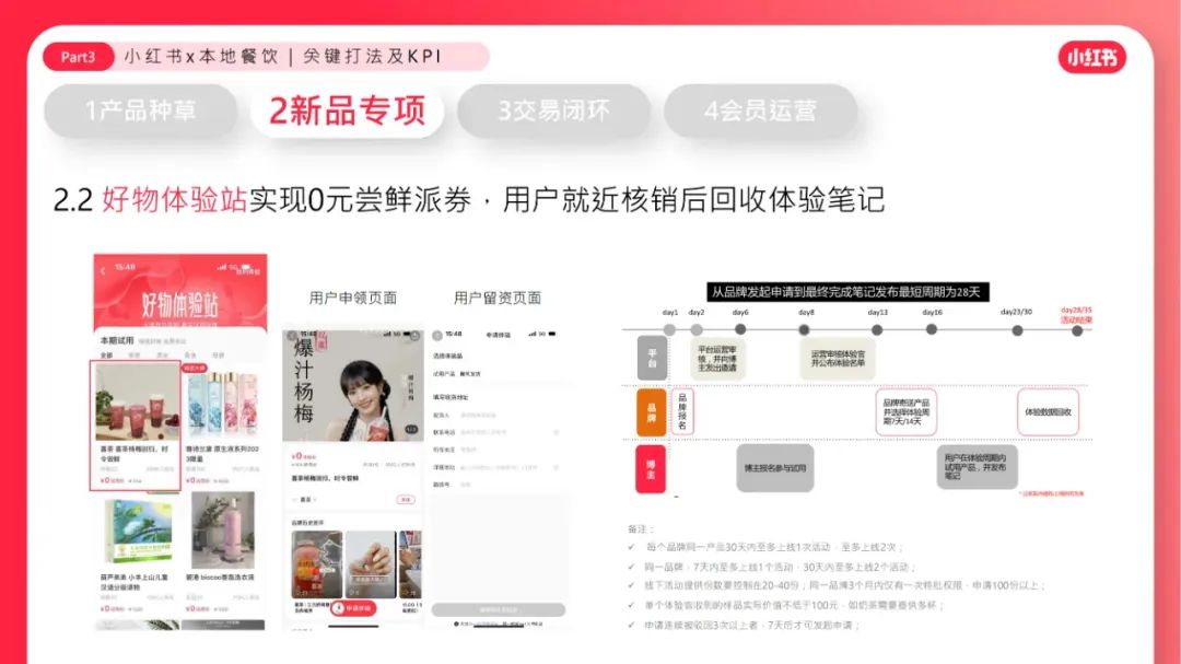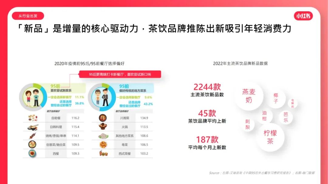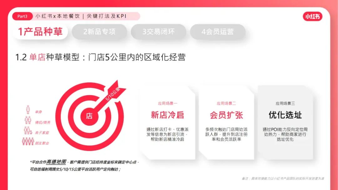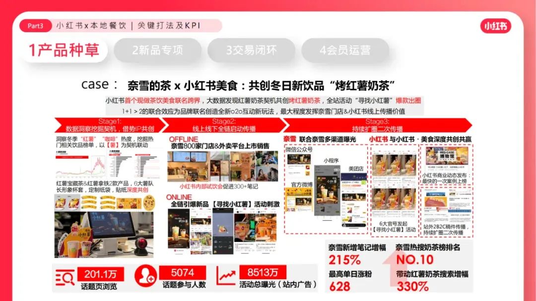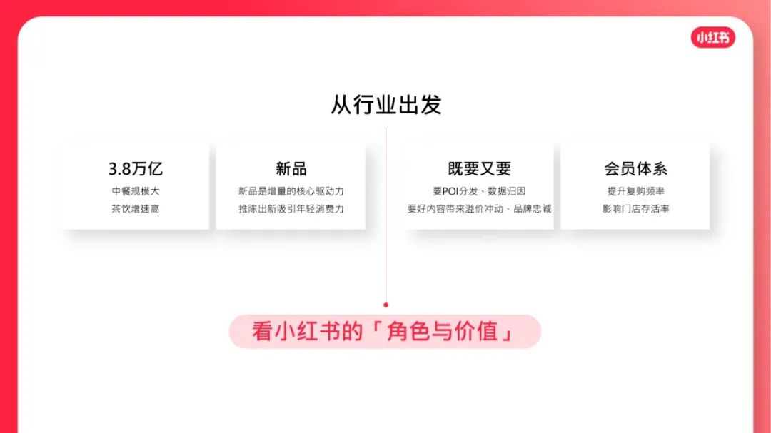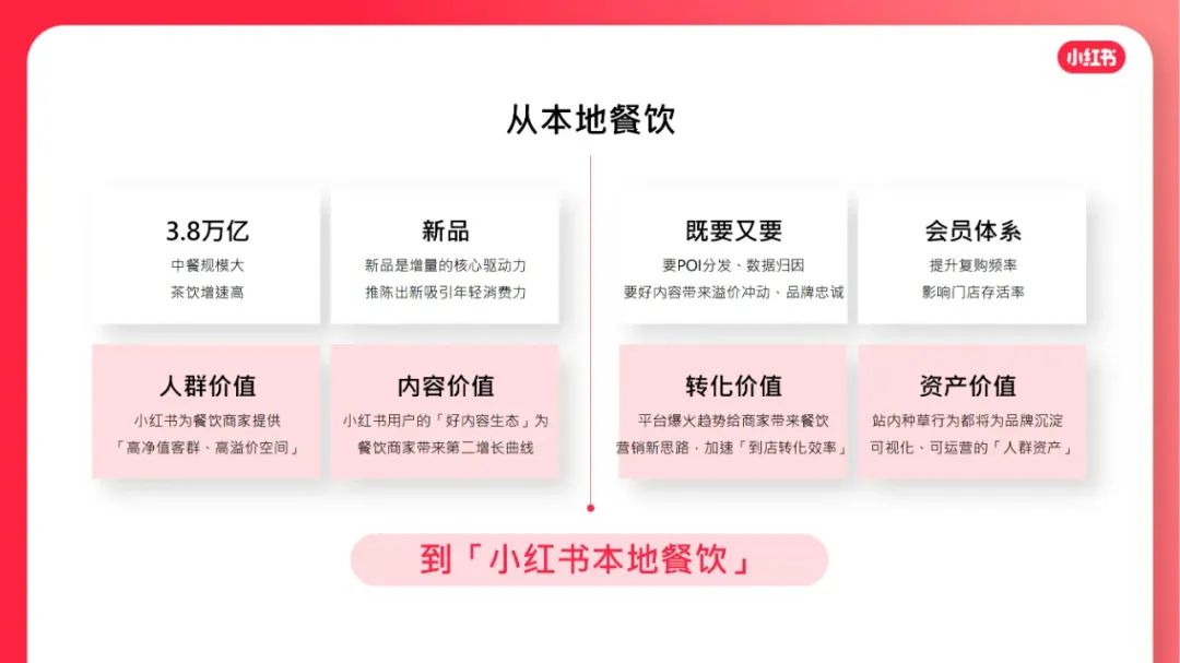 到店餐饮市场规模约3.8万亿,「中餐」规模最⼤,「茶饮」增⻓率最⾼。「新品」是增量的核⼼驱动⼒,茶饮品牌推陈出新吸引年轻消费⼒。商家要POI分发、数据归因,也要「好内容」带来溢价冲动、品牌忠诚。越来越多商家重视因「会员体系」带来的复购频率和⻔店存活率。年轻有活力的用户都在小红书。⼩红书为餐饮商家提供「⾼净值客群、⾼溢价空间」。⼩红书⽤户的「好内容⽣态」为餐饮商家带来第⼆增⻓曲线。