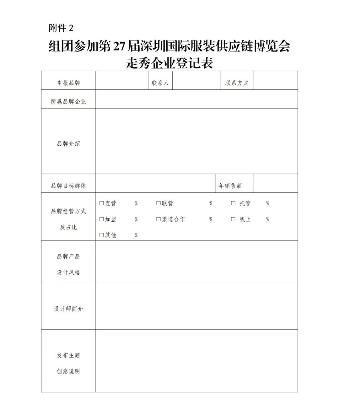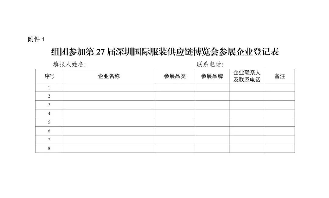 面向县内纺织服装企业发出邀约,有意向的可填写《组团参加第27届深圳国际服装供应链博览会参展企业登记表》或《组团参加第27届深圳国际服装供应链博览会走秀企业登记表》,于8月13日(星期天)上午12:00前报县服装服饰行业协会,联系人:张海,联系电话:13970129393,邮箱:yudufzfsxh@163.com。市纺织服装产业办将根据申报报名情况,择优选定参展企业及走秀企业。