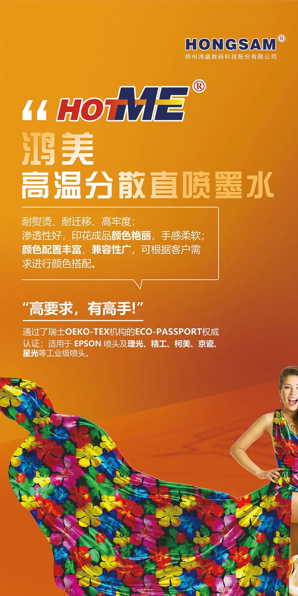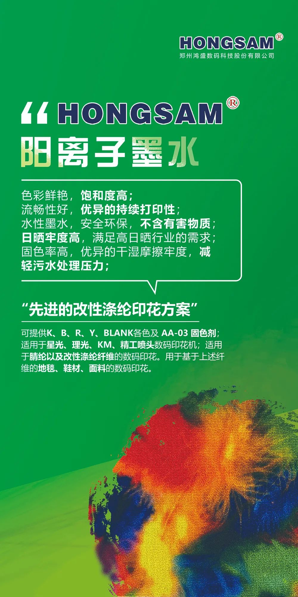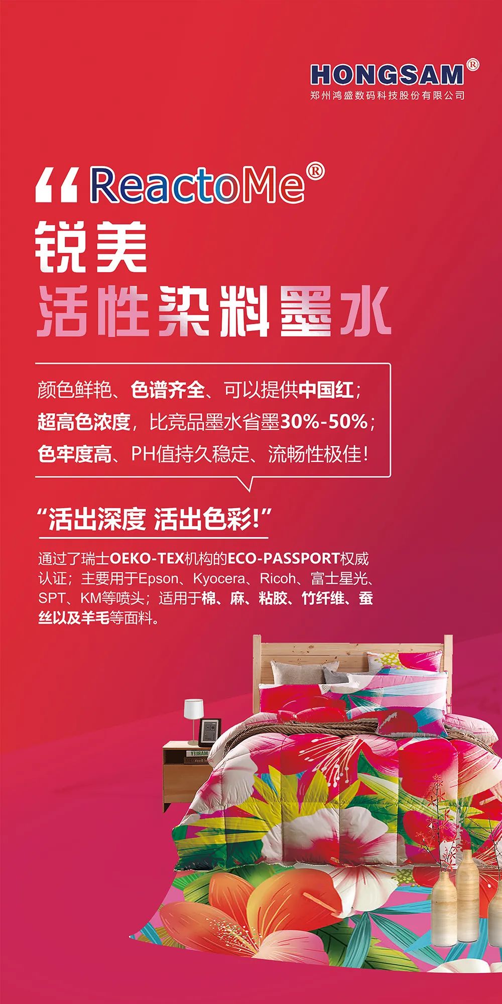 此次盛会,鸿盛数码将携鸿盛全系列数码印花系列墨水(捷特丝纺织涂料系列墨水、鸿美分散系列墨水、丝美特酸性染料墨水、锐美活性染料墨水、阳离子染料墨水)及鸿捷免抖粉烫画方案集结亮相展会现场,鸿盛数码针对不同工艺及应用,提供优质产品及完善的解决方案。