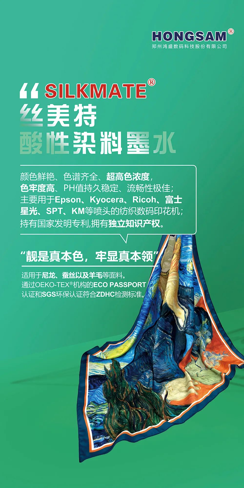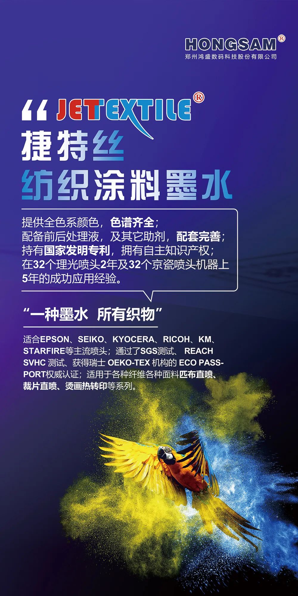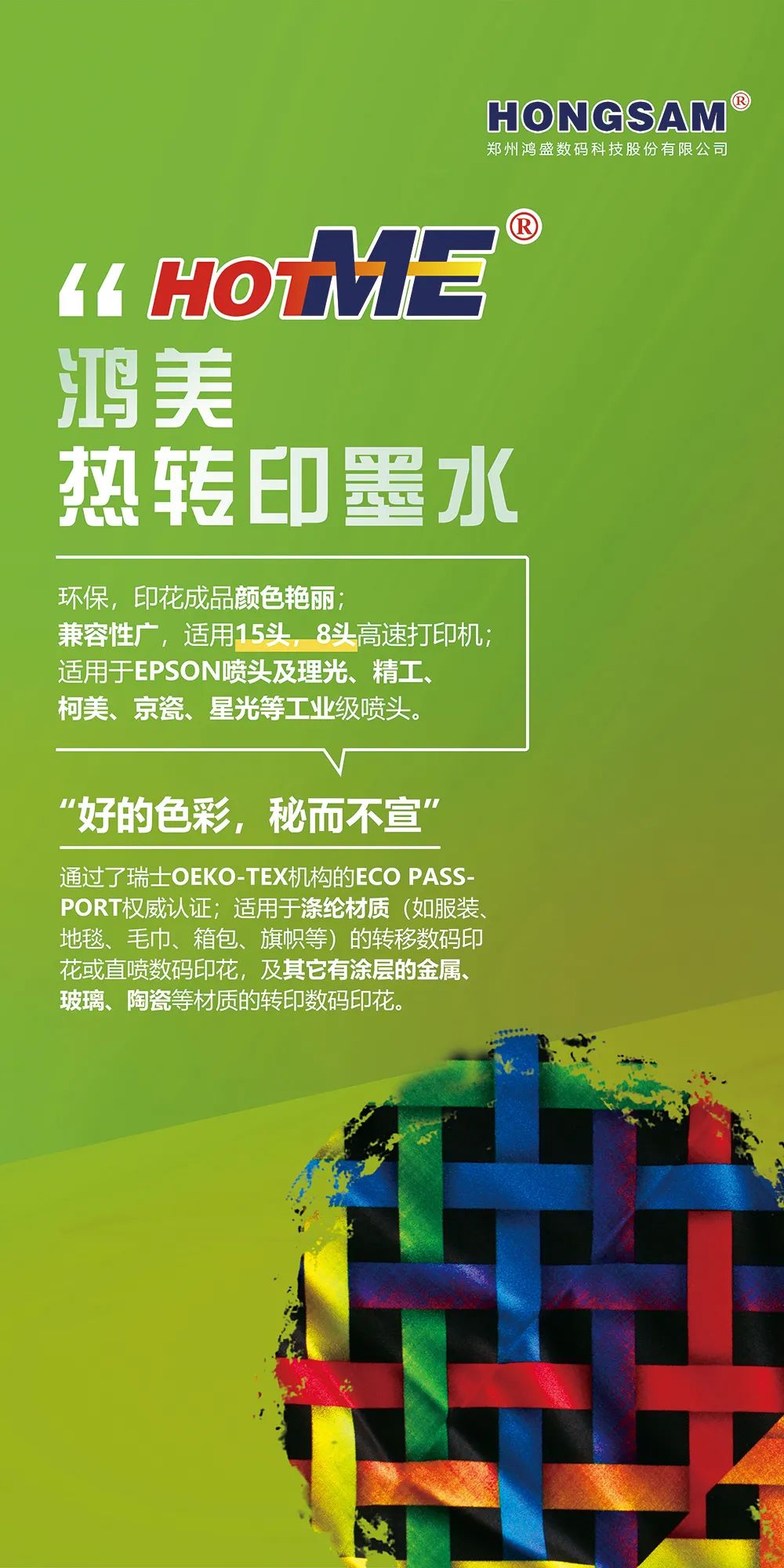 此次盛会,鸿盛数码将携鸿盛全系列数码印花系列墨水(捷特丝纺织涂料系列墨水、鸿美分散系列墨水、丝美特酸性染料墨水、锐美活性染料墨水、阳离子染料墨水)及鸿捷免抖粉烫画方案集结亮相展会现场,鸿盛数码针对不同工艺及应用,提供优质产品及完善的解决方案。