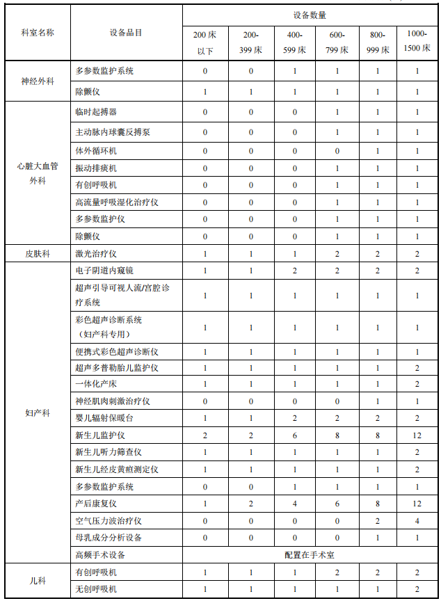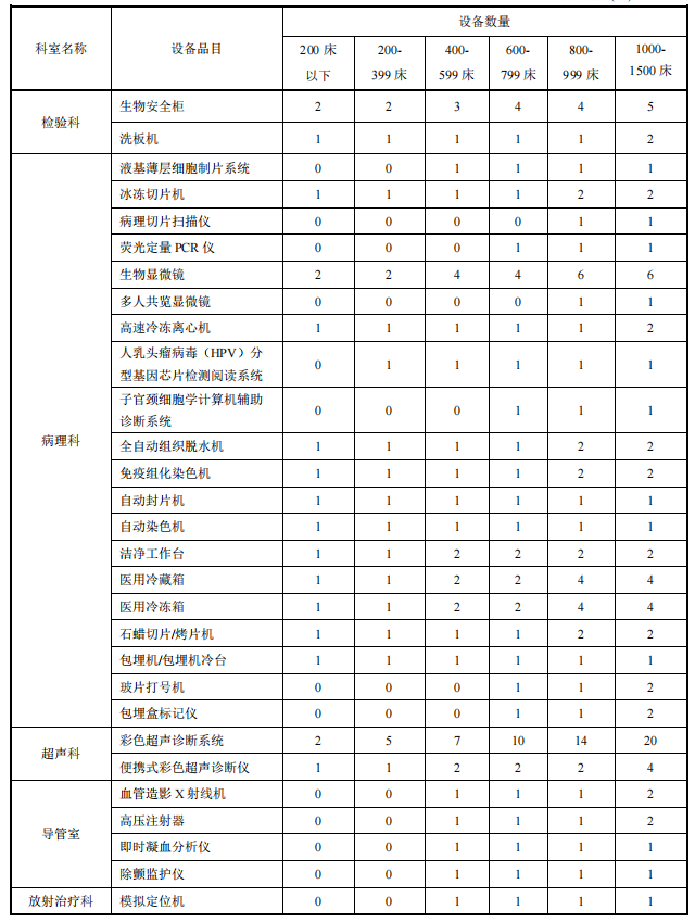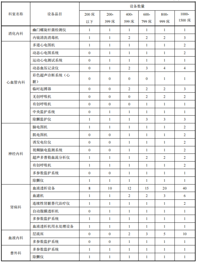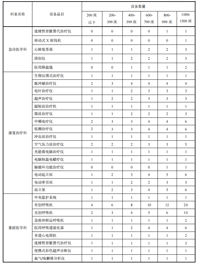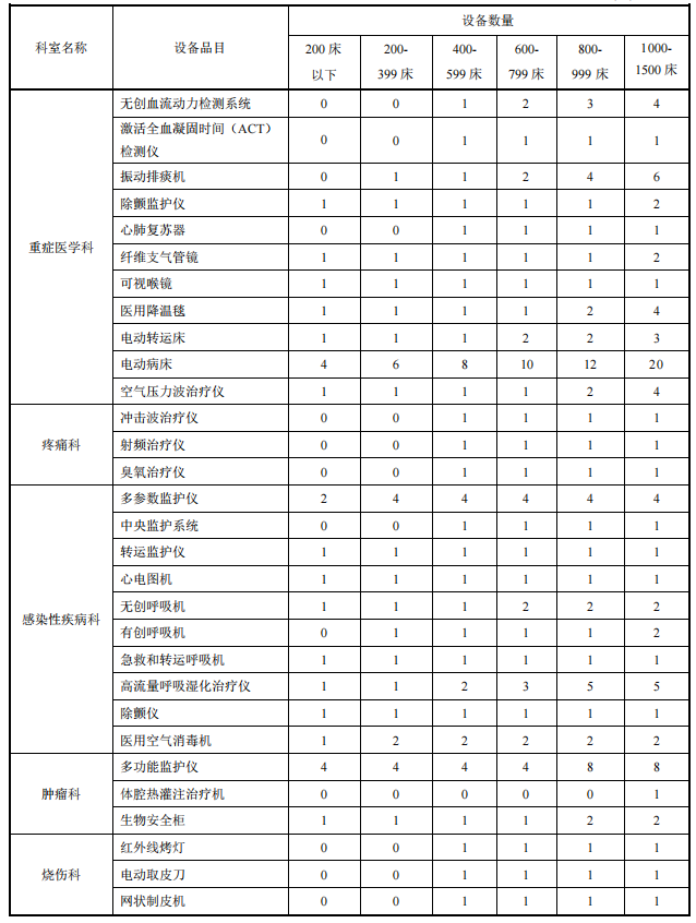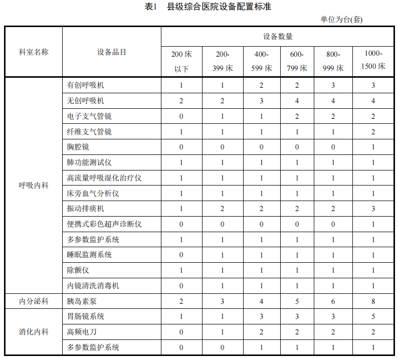 不同规模的县级综合医院临床科室、医技科室、辅助科室万元以上设备配置数量可参照表 1 执行。万元以下设备如输注泵等, 县级综合医院根据自身发展需求进行配置。本标准规定了设备配置数量的最低标准, 各县级综合医院可根据规模和服务需求合理配置。