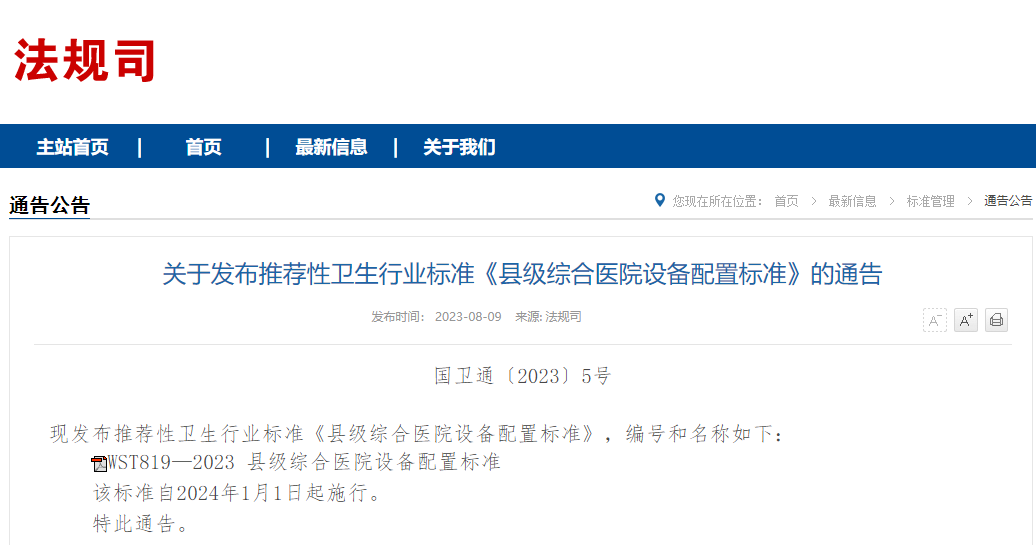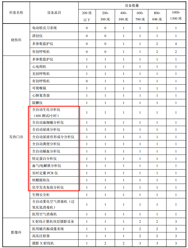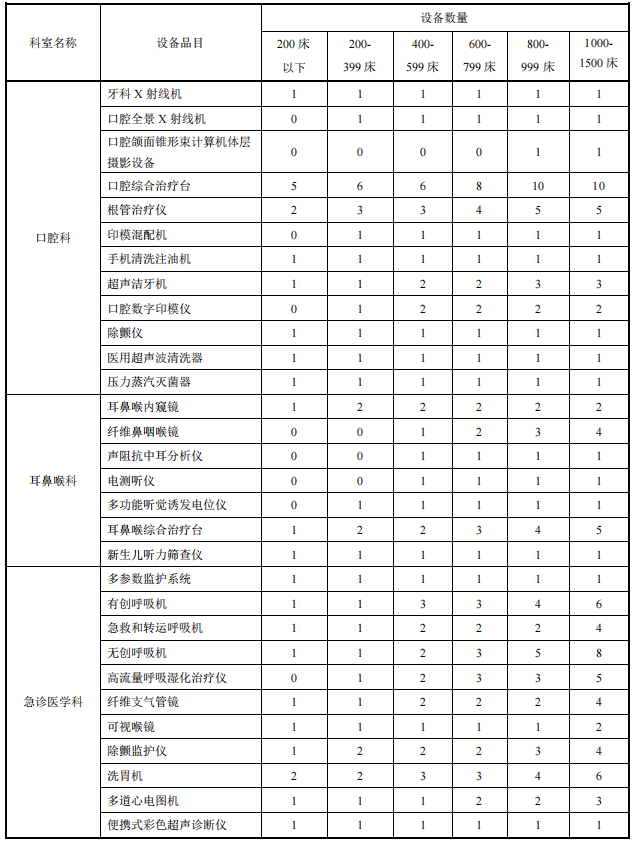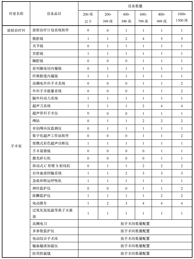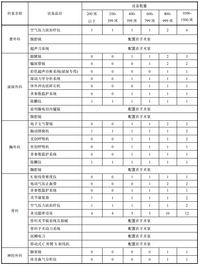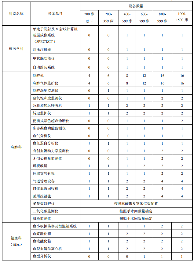 不同规模的县级综合医院临床科室、医技科室、辅助科室万元以上设备配置数量可参照表 1 执行。万元以下设备如输注泵等, 县级综合医院根据自身发展需求进行配置。本标准规定了设备配置数量的最低标准, 各县级综合医院可根据规模和服务需求合理配置。