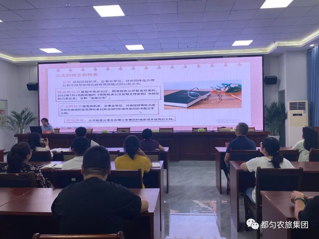 为进一步提升市农旅集团及下属企业干部职工公文写作水平,提高办公室综合办文能力,根据市农旅集团2023年“农旅小课堂”实施方案相关安排,2023年8月4日,都匀市农旅集团组织开展公文写作专题培训,并邀请市政府办秘书二科负责人付歆尧同志授课,市农旅集团及下属四家二级子公司全体干部职工参加培训。