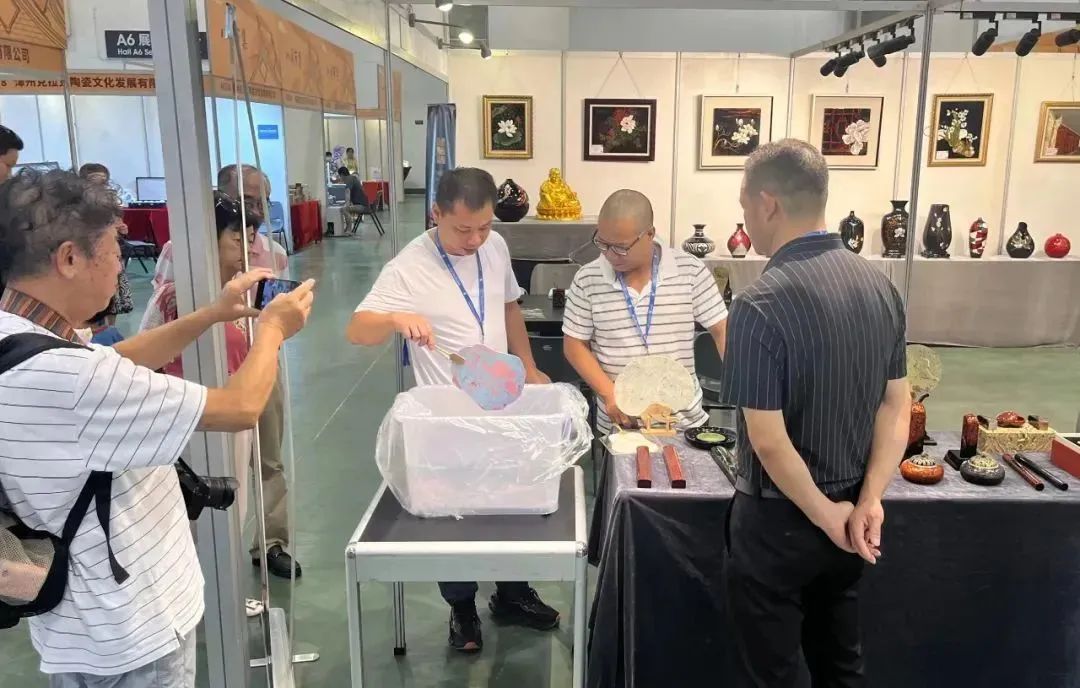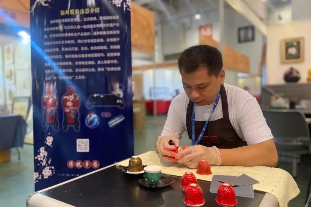在海峡两岸文博会现场,福州漆艺公司向市民朋友们展现了琳琅满目的脱胎漆瓶、茶盘、茶具、饰品等漆工艺品,现场介绍解说了福州传统脱胎漆器相关文化传承历史及其制作工艺等。