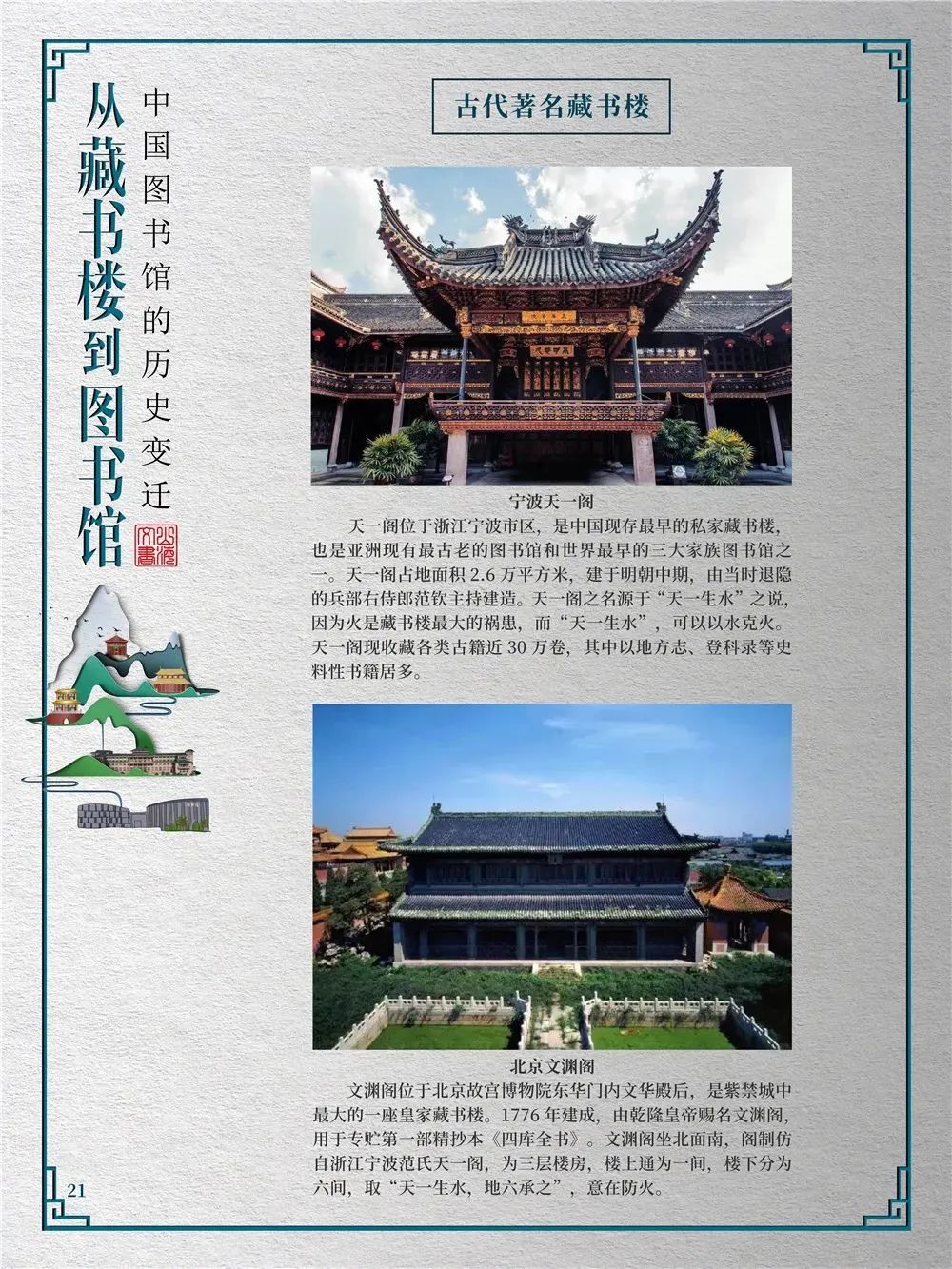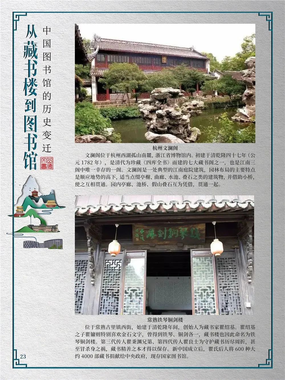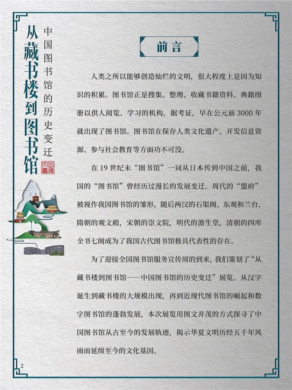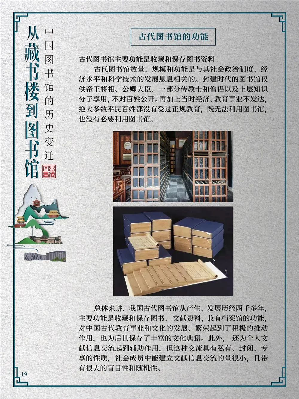 为此,莲池区图书馆举办“从藏书楼到图书馆——中国图书馆的历史变迁”展览,用图文并茂的方式同读者们一起探寻中国图书馆从古至今的发展轨迹,揭示华夏文明历经五千年风雨而延绵至今的文化基因。
