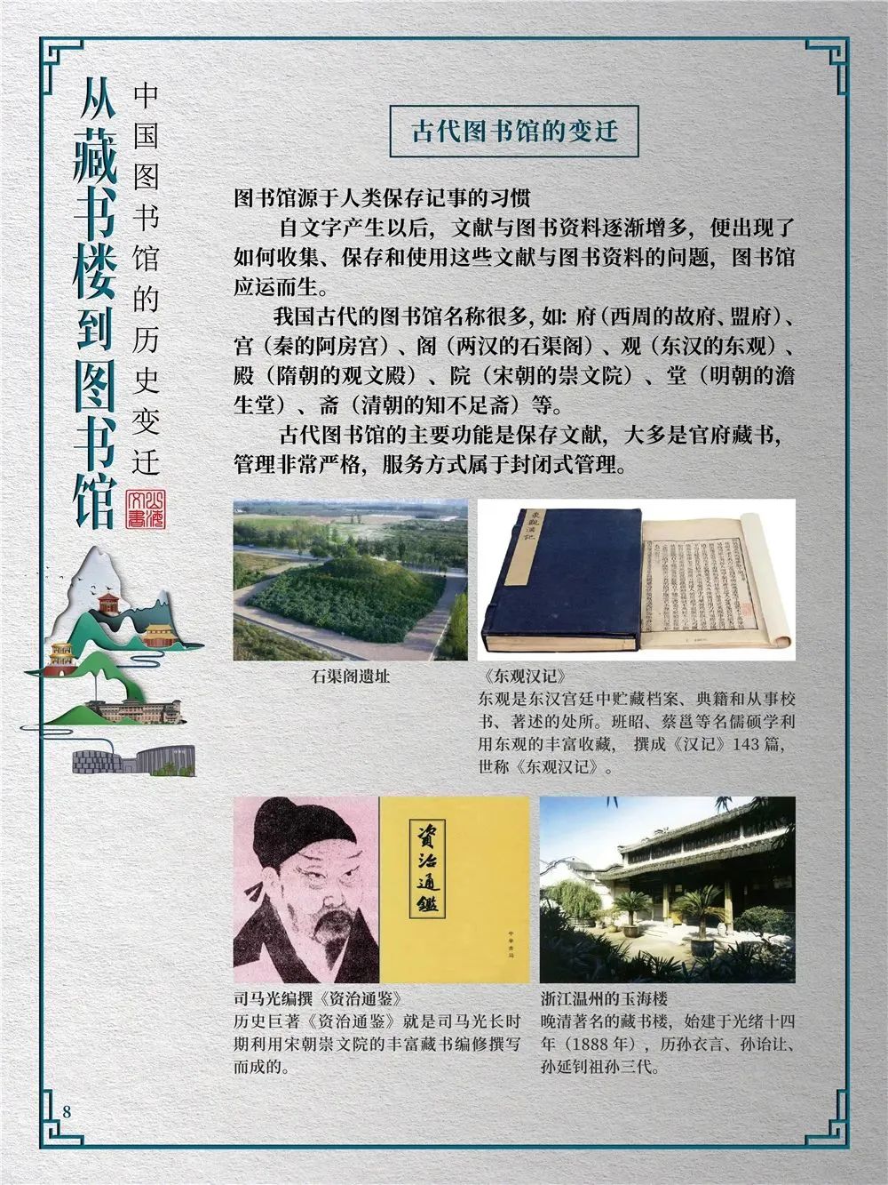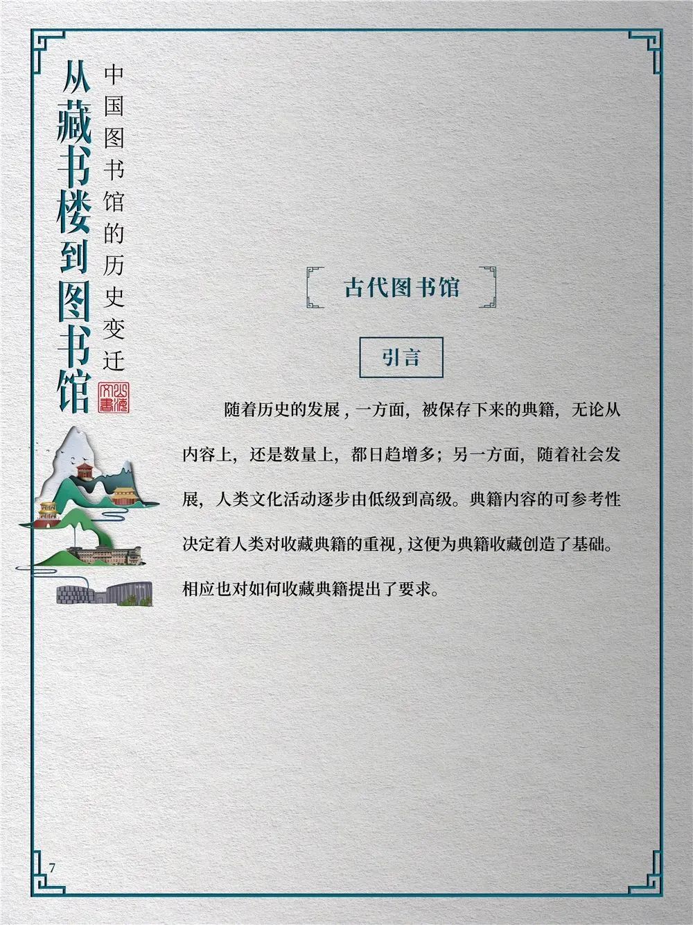 人类之所以能够创造灿烂的文明,很大程度上是因为知识的积累。图书馆正是搜集、整理、收藏书籍资料、典籍图册以供人阅览、学习的机构。图书馆在保存人类文化遗产、开发信息资源、参与社会教育等方面功不可没。
