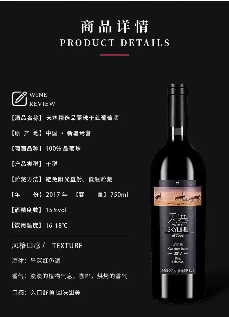 -呈深红色边缘带紫;具有明显的品种典型香气,如黑醋栗等黑色浆果并伴随秋叶和干药草的气息;口感纯净,充满清新果香,酒体饱满,结构均衡,回味无穷。天塞精选品丽珠干红葡萄酒