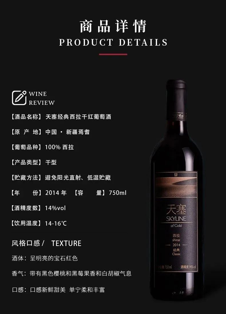-呈深红色,散发黑樱桃、桑葚、黑莓等黑色水果香气,与优质法国橡木桶带来的咖啡香、香草香完美融合;入口饱满浓郁,结构平衡,回味悠长。