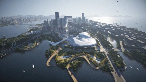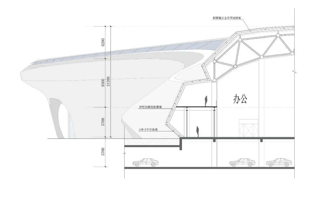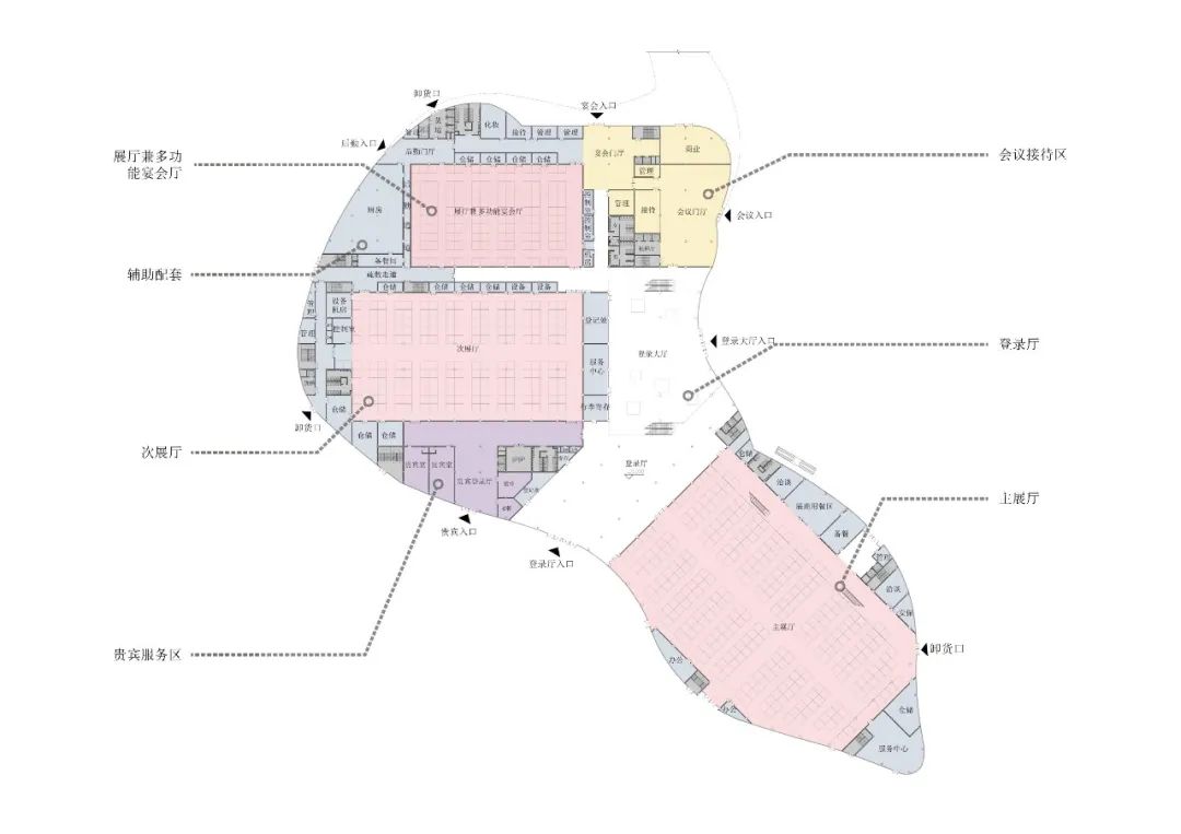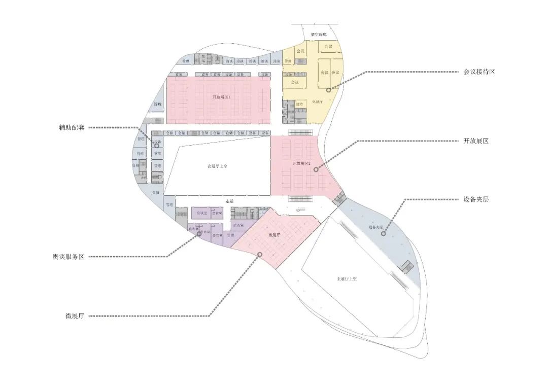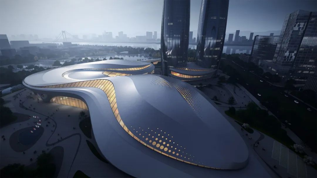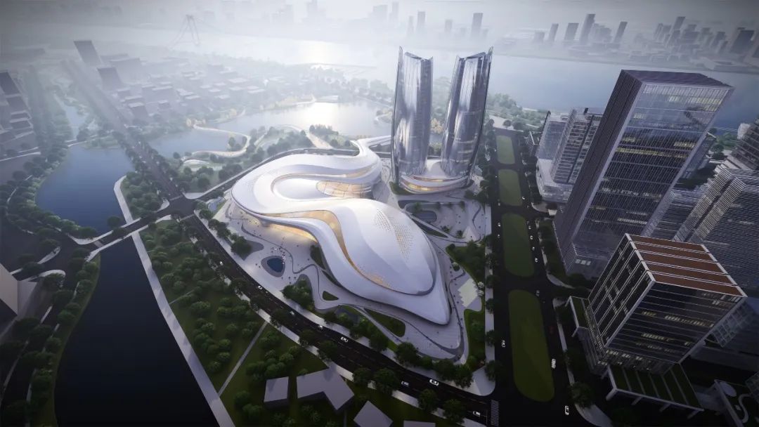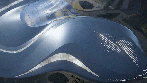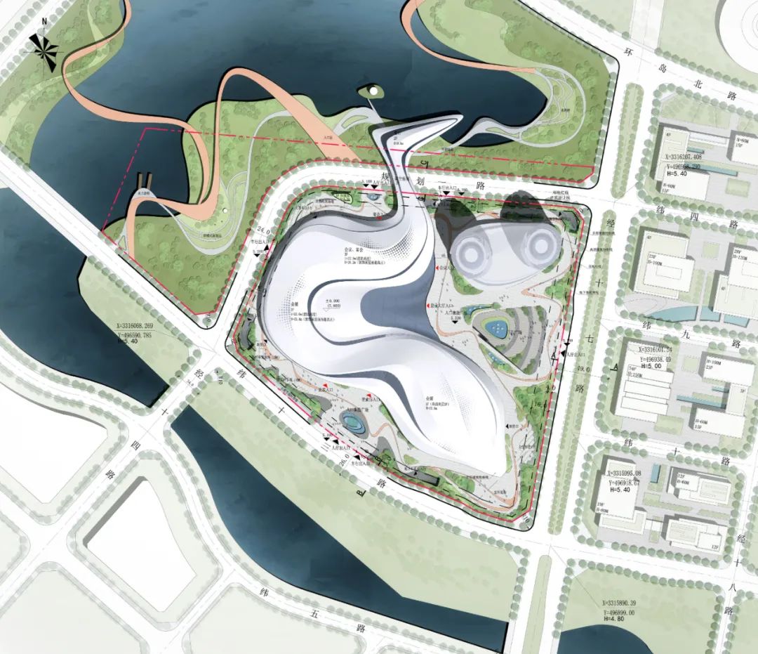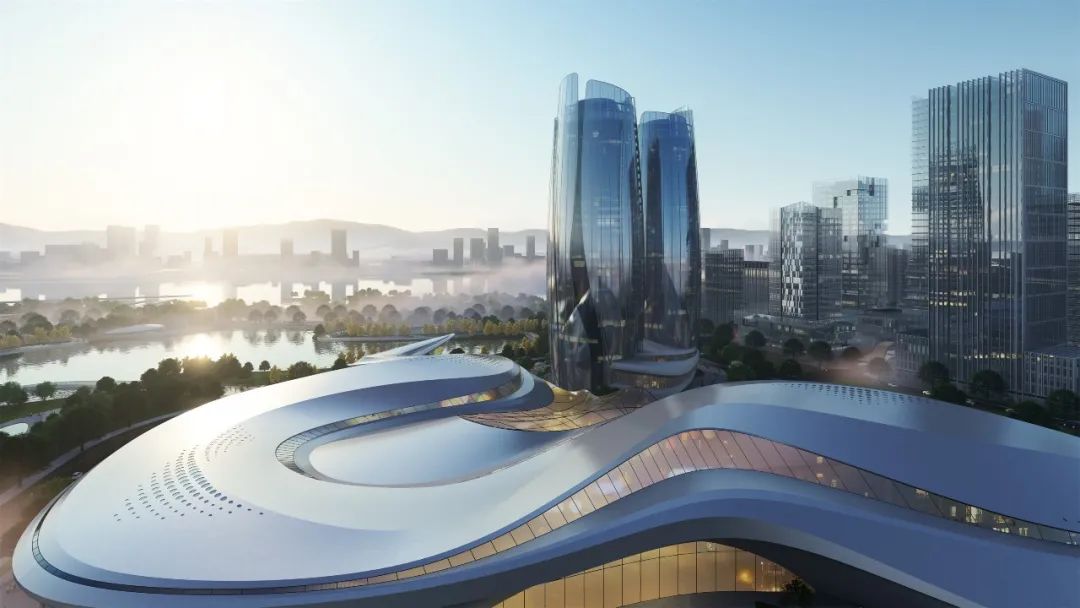 设计结合舟山海洋地域文化,提出了“海之灵”的设计理念,将这个巨大地标性建筑与海中灵动的鱼群相呼应与融合,一方面减弱了建筑体型与空间的压迫感,同时也赋予这个建筑轻盈灵动的城市形态,创造出一座造型优美的会展中心建筑。柔美动感的空间形态也宛如海中跃起,突出了舟山海洋文化之城的地域特征。提取舟山地貌与海水灵动的意象,总体城市设计以“海浪”、“鱼群”、“旋涡”为意象来设计整体建筑形态与城市环境肌理。设计通过大胆创意的设计与周边城市环境,以及舟山蜿蜒曲折的海岸线来对话与呼应;采用统一的艺术设计语言串联场地与滨水公园的关系,打造了开放共享、活力创新的城市与景观空间。总图规划布局结合会展中心广场配备了水景、绿地、雕塑等多类型景观要素,打造了区域休闲共享的活力中心,同时合理布置会展室外的硬质场地用以满足会展建筑的各类人行,货运,室外展场等需求。场地共设置三处主要的人行出入口,其中南侧为面向城市的会展形象出入口,北侧为宴会酒店等出入口,东侧结合景观台阶、下沉庭院等设计了休憩广场入口,快速方便地连接了本地块建筑与东侧商务区。场地共设置了三处车行出入口,就近设置地下车库出入口,减少车流对场地内的影响,从而最大程度做到人车分流。会展中心共三层,位于场地西南侧,以展览功能为主。一层包括登录厅、主展厅、次展厅以及一个多功能宴会厅,并且独立设置会议区以及贵宾洽谈区入口。二层设置了一个微展厅和一个次展厅,同时包括独立的餐饮、会议、贵宾洽谈区。三层包括一个微展厅和两个开放展厅,以及会议等其他辅助仓储功能。考虑到适应多种布展需求,整个会展中心共设置八个不同尺度的室内展厅,一个室外展场,规模共计约1500个展位。本工程展厅屋盖和楼盖均为大跨度结构,重点进行大跨钢结构-金属屋面一体化设计研究。提出贴合异形屋面造型的大跨钢结构方案,降低金属屋面二次找形的设计与施工难度;会展建筑采用半单元框架幕墙形式,异形铝蜂窝幕墙在车间完成准确制作后,现场通过幕墙框架龙骨浮动连接,减少施工周期的同时,确保立面满足方案设计效果。结语