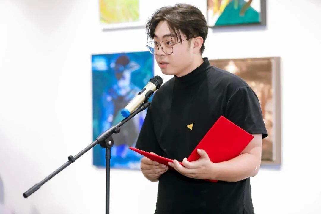 九零创作画社社长白固上台致辞时,通过实际经历,细致入微地讲述作品背后的创作故事,通过切身体会和分享让一众嘉宾感受到了青年艺术家独特的艺术气质和使命感。